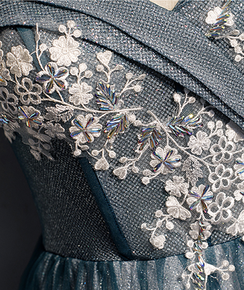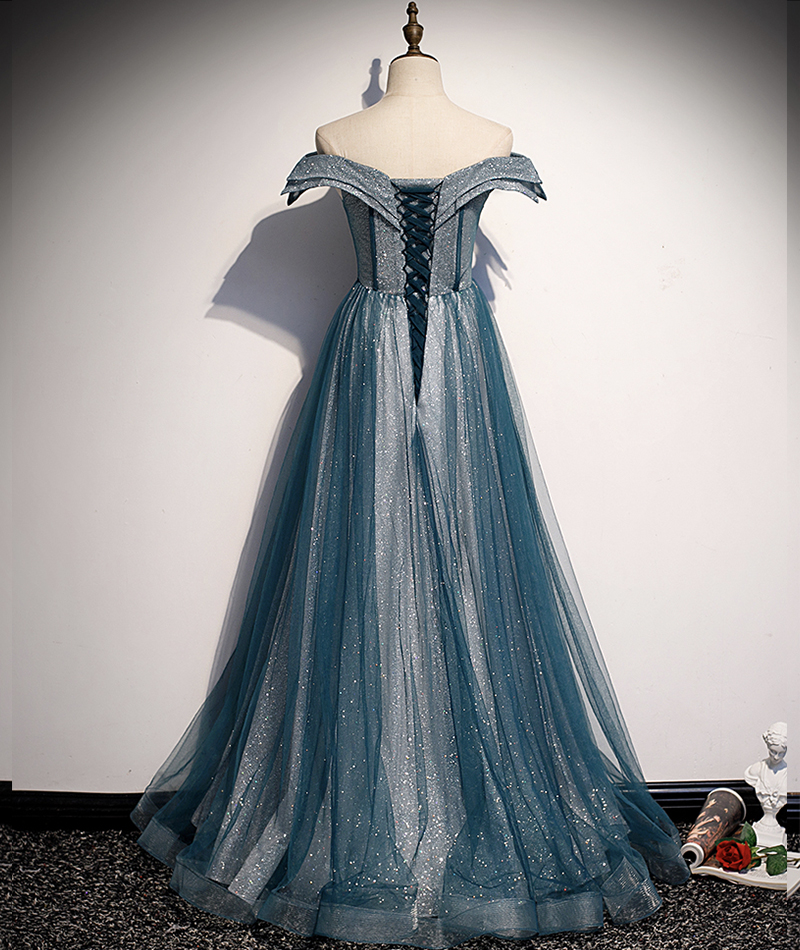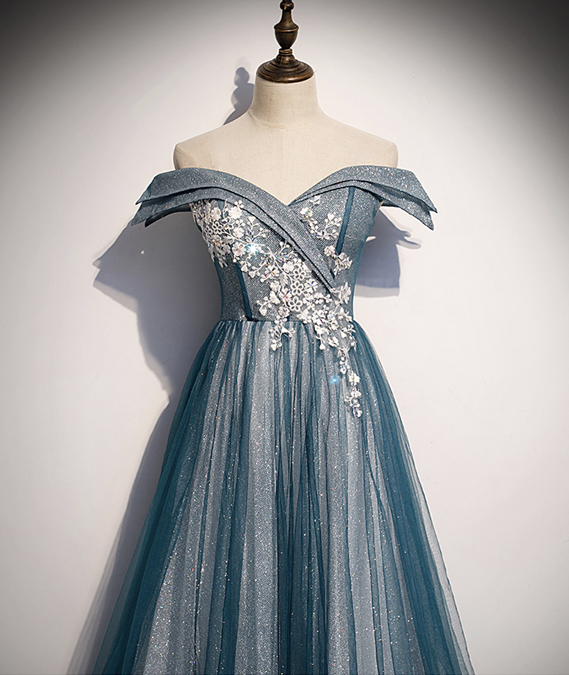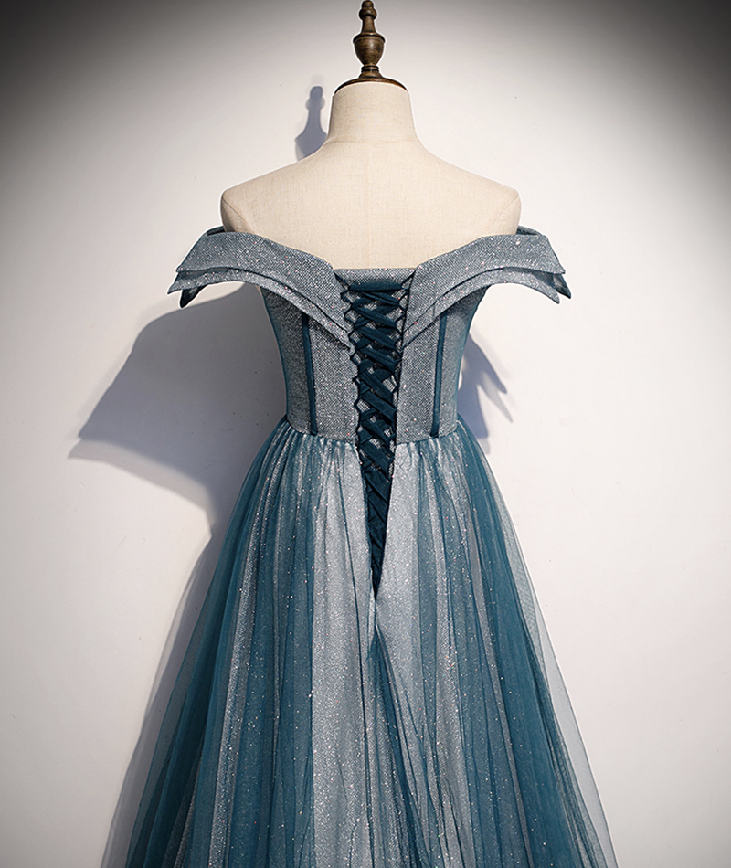 - Blue tulle lace long prom dress off shoulder evening dress -