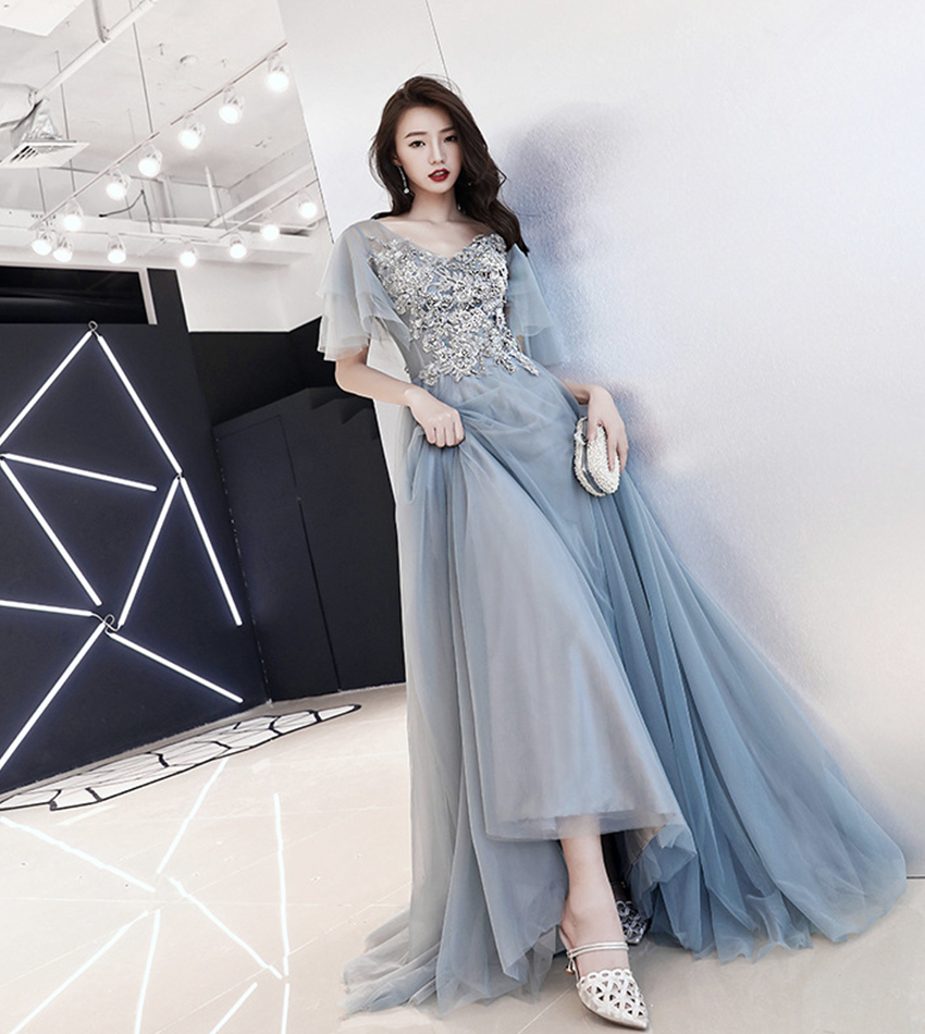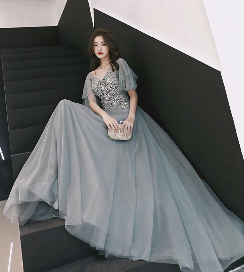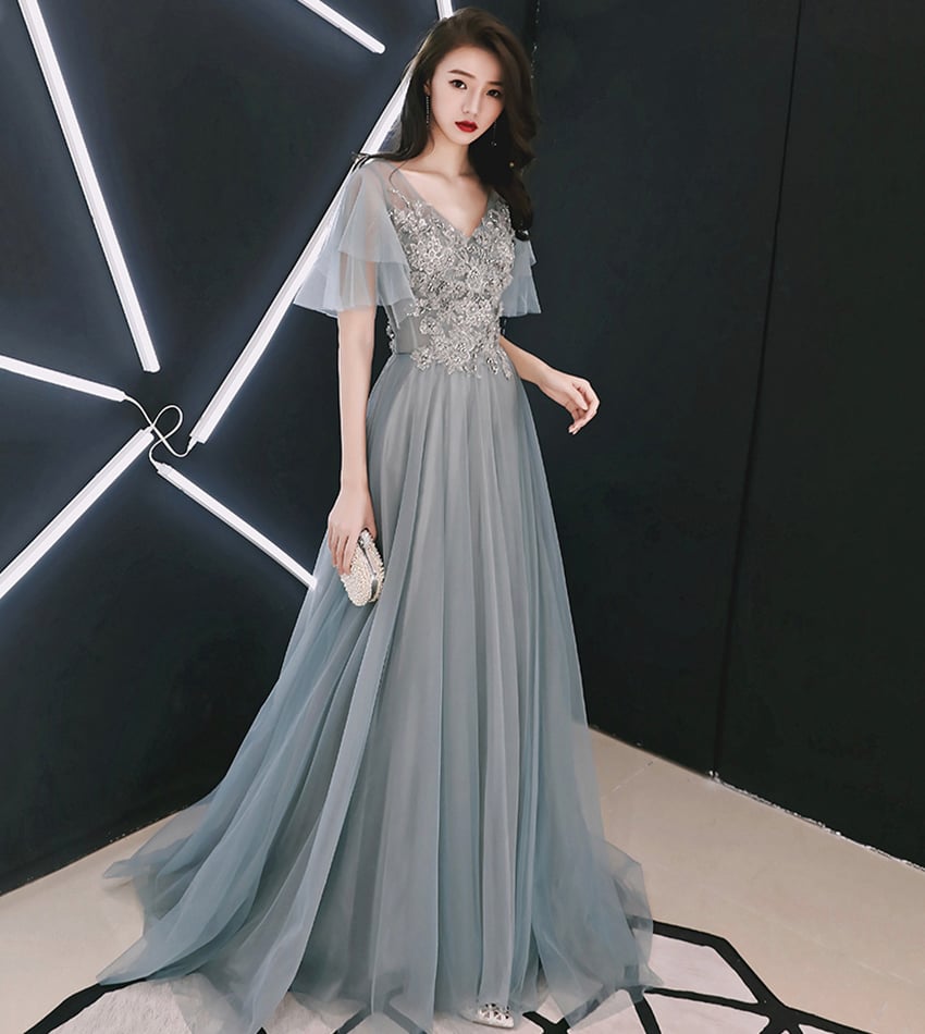 - Grey tulle lace long prom dress lace evening dress -