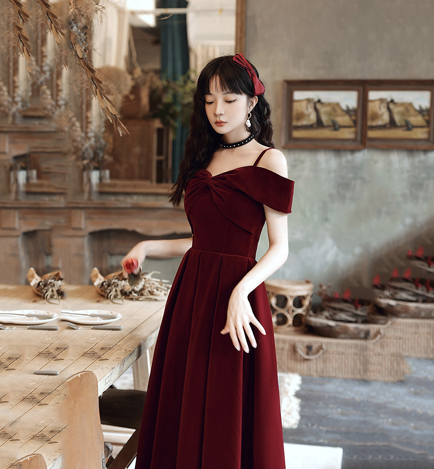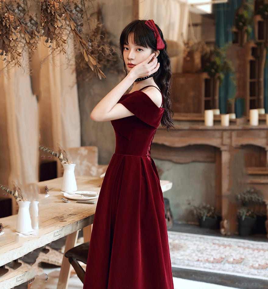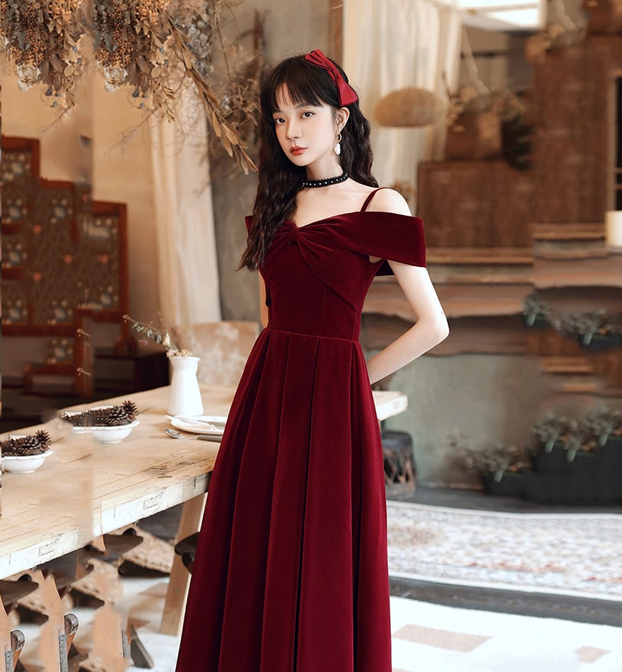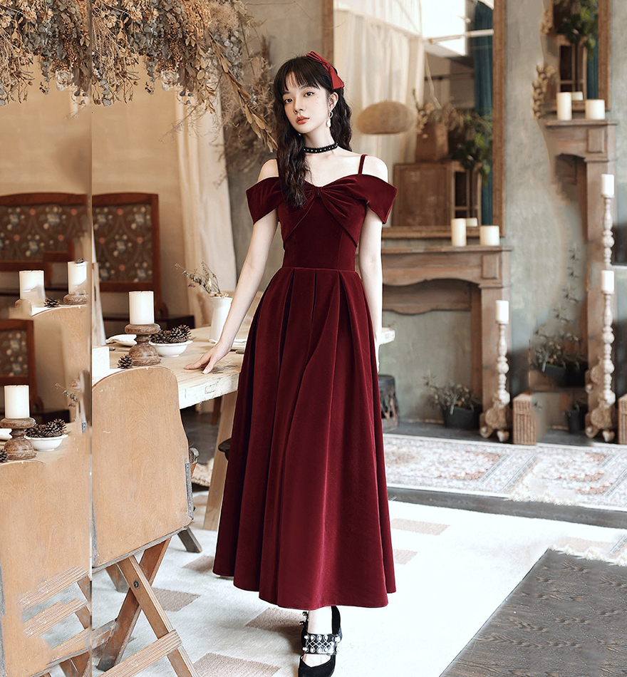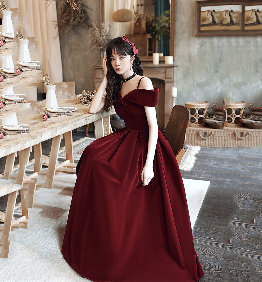 - Cute A line velvet prom dress burgundy evening dress -