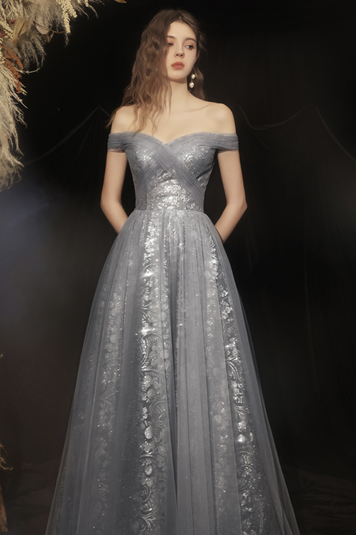 - Grey long A line prom dress off shoulder evening dress -