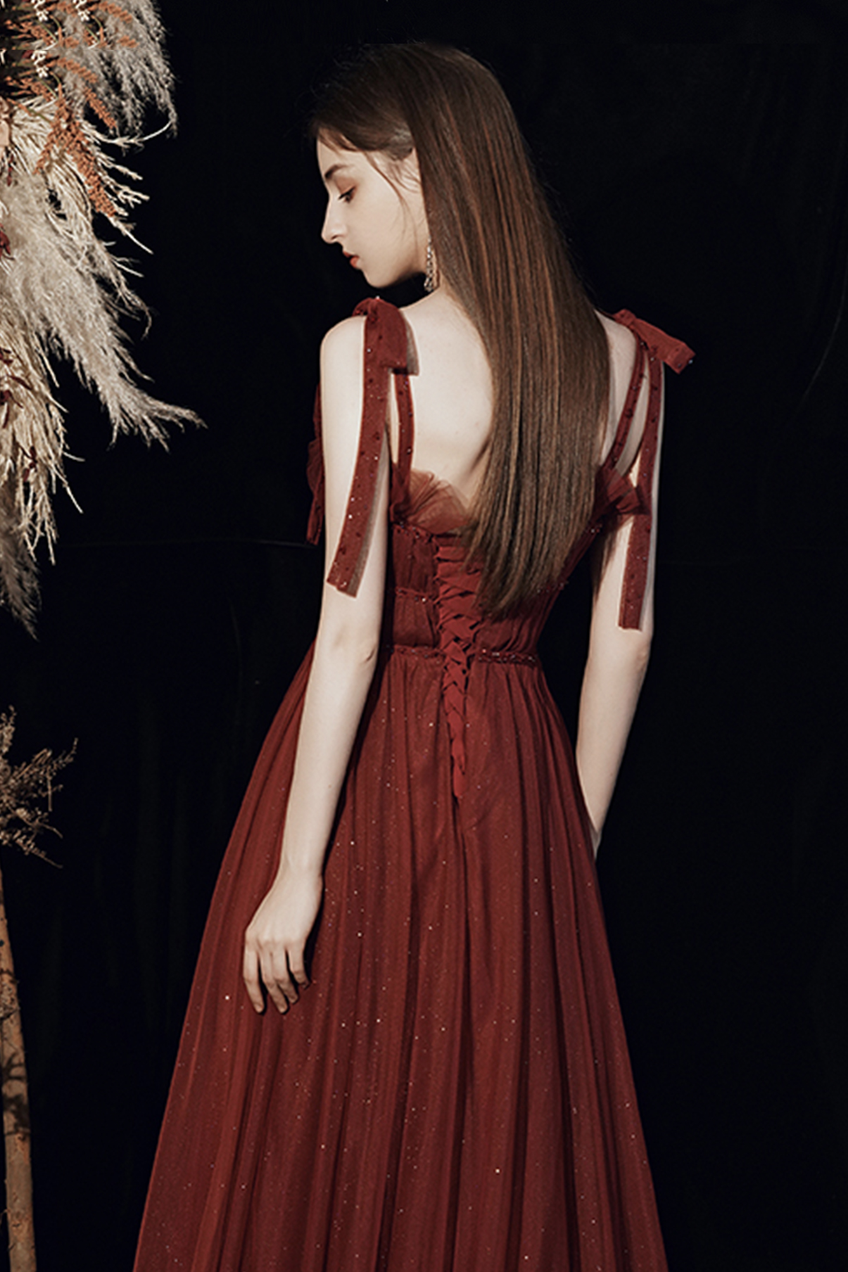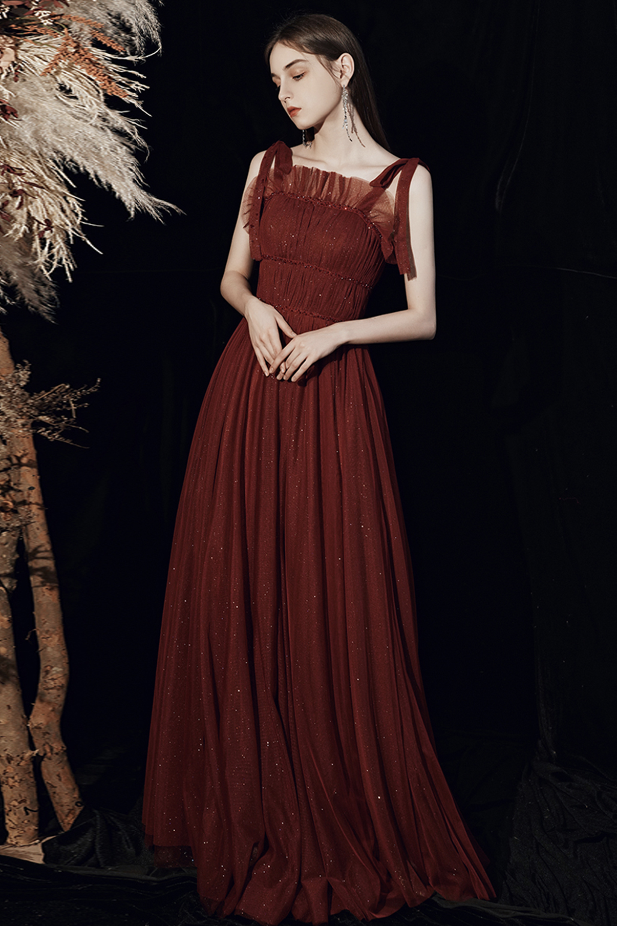 - Burgundy tulle long A line prom dress evening dress -