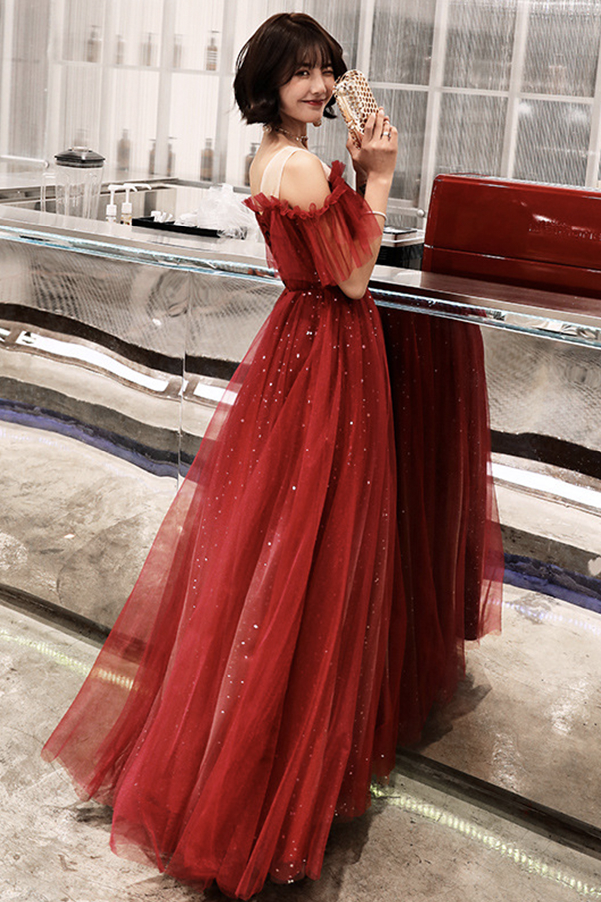 - Stylish tulle sequins long A line prom dress evening dress -