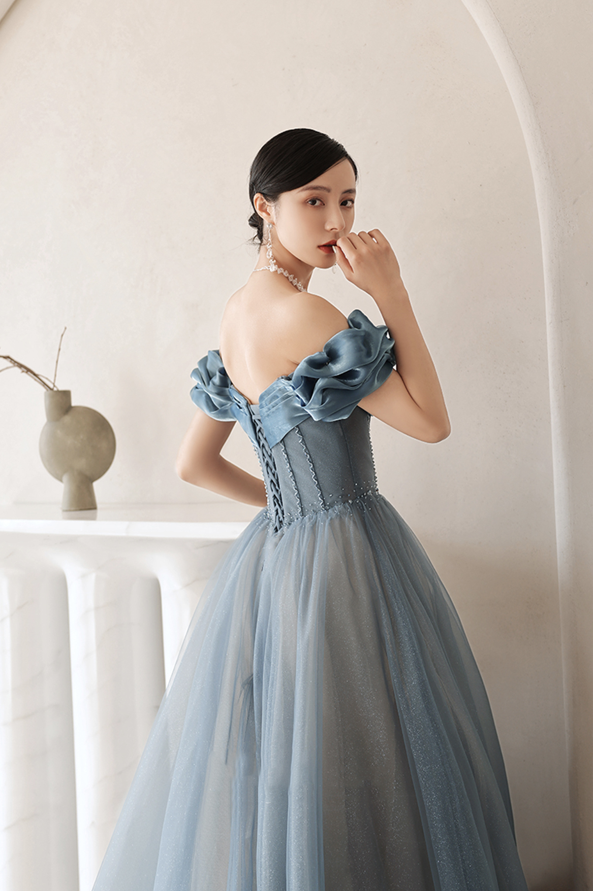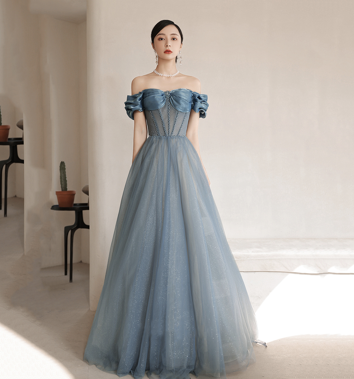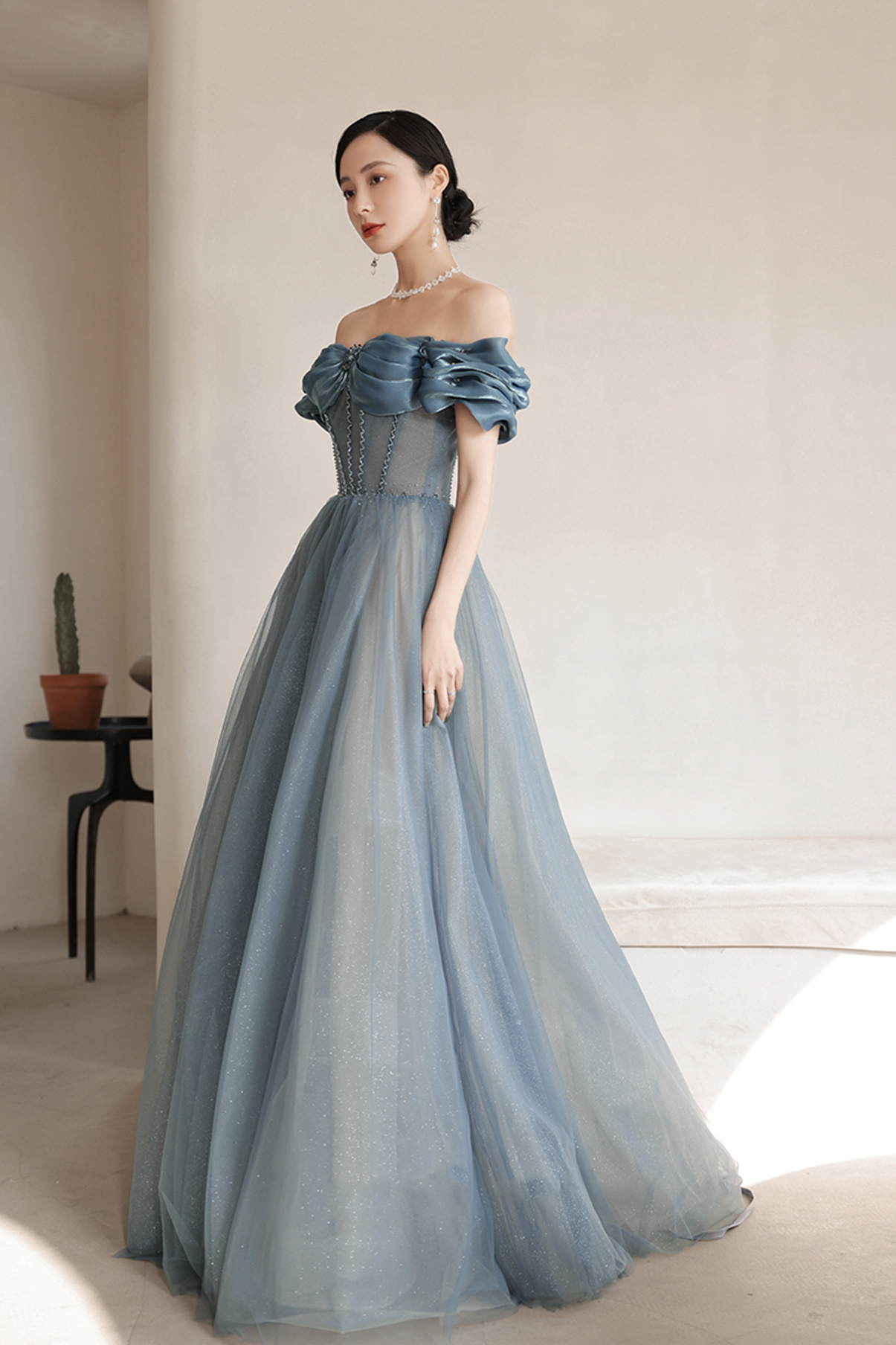 - Blue tulle long A line prom dress off shoulder evening dress -
