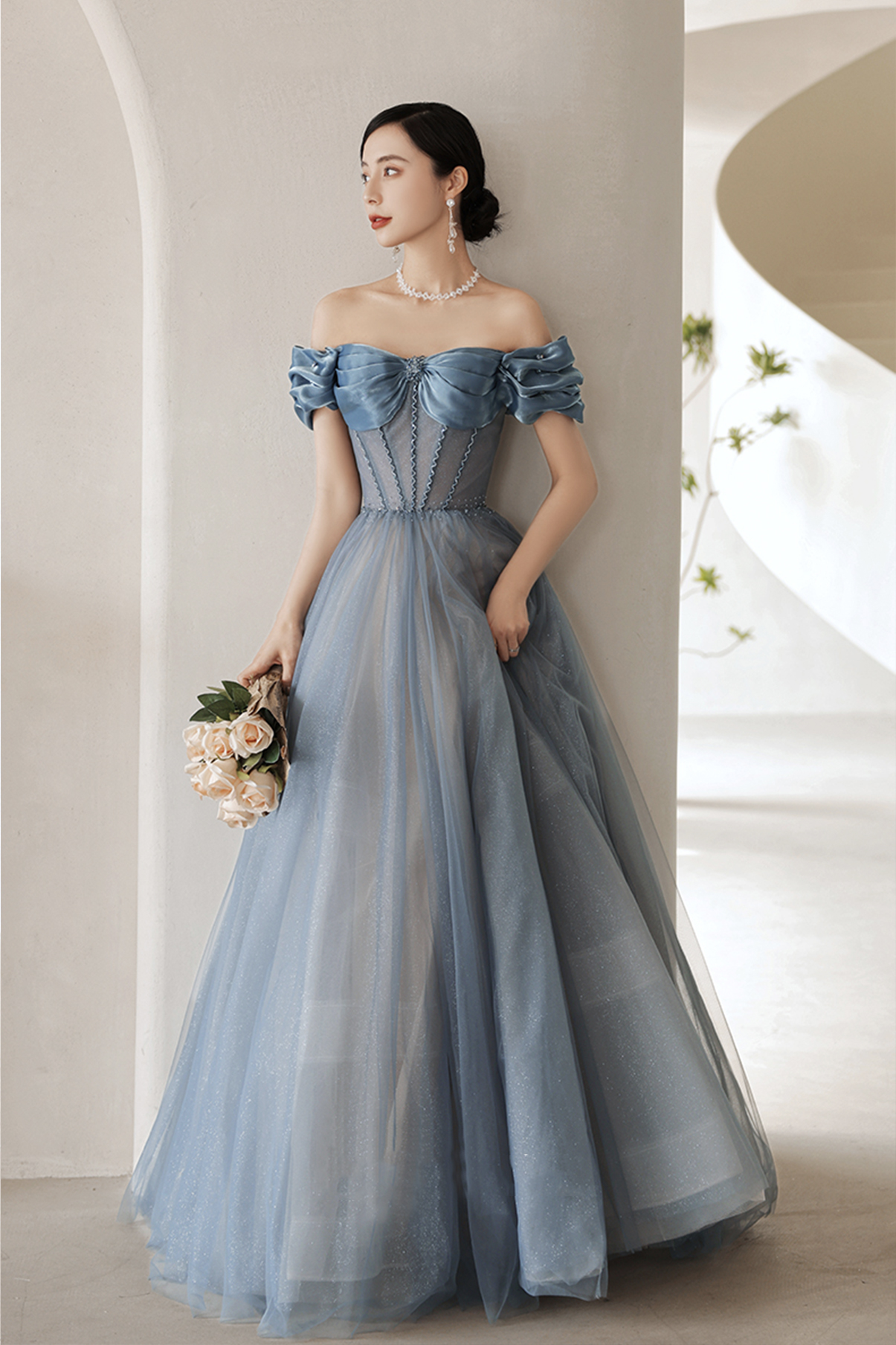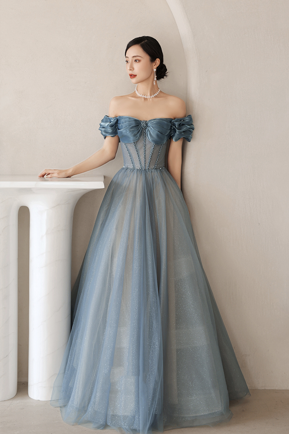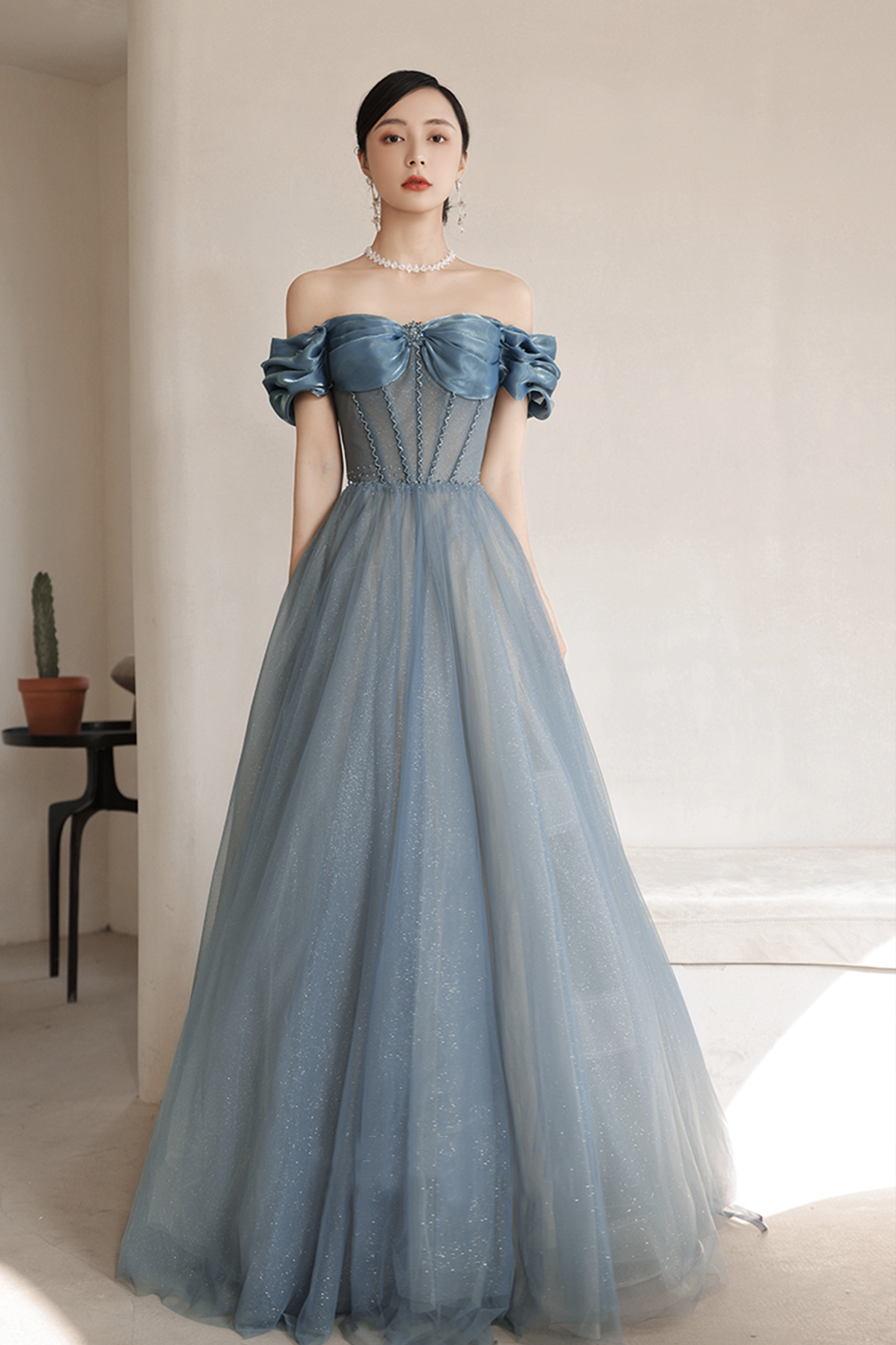 - Blue tulle long A line prom dress off shoulder evening dress -