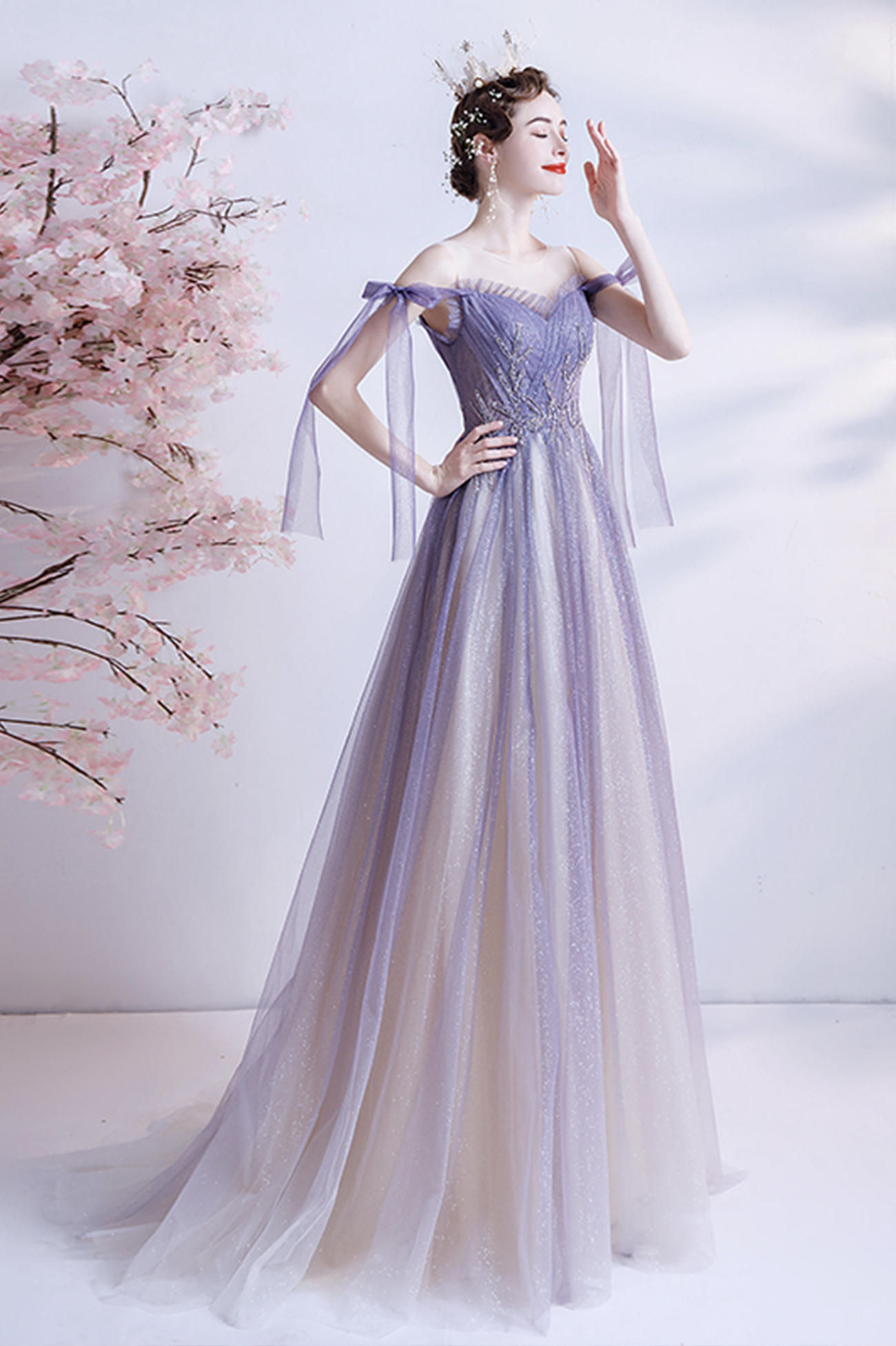 - Purple tulle long A line prom dress evening dress -