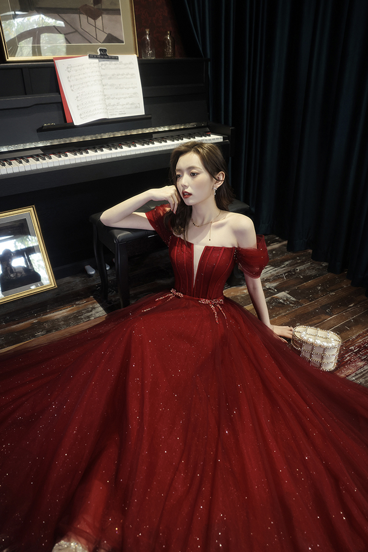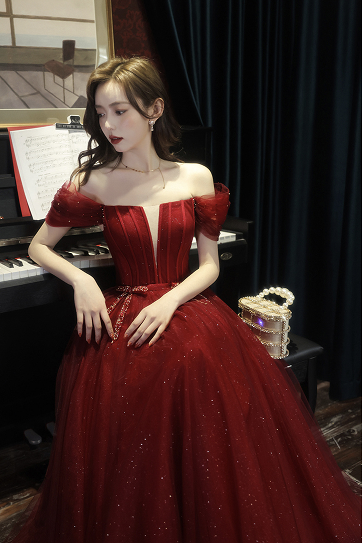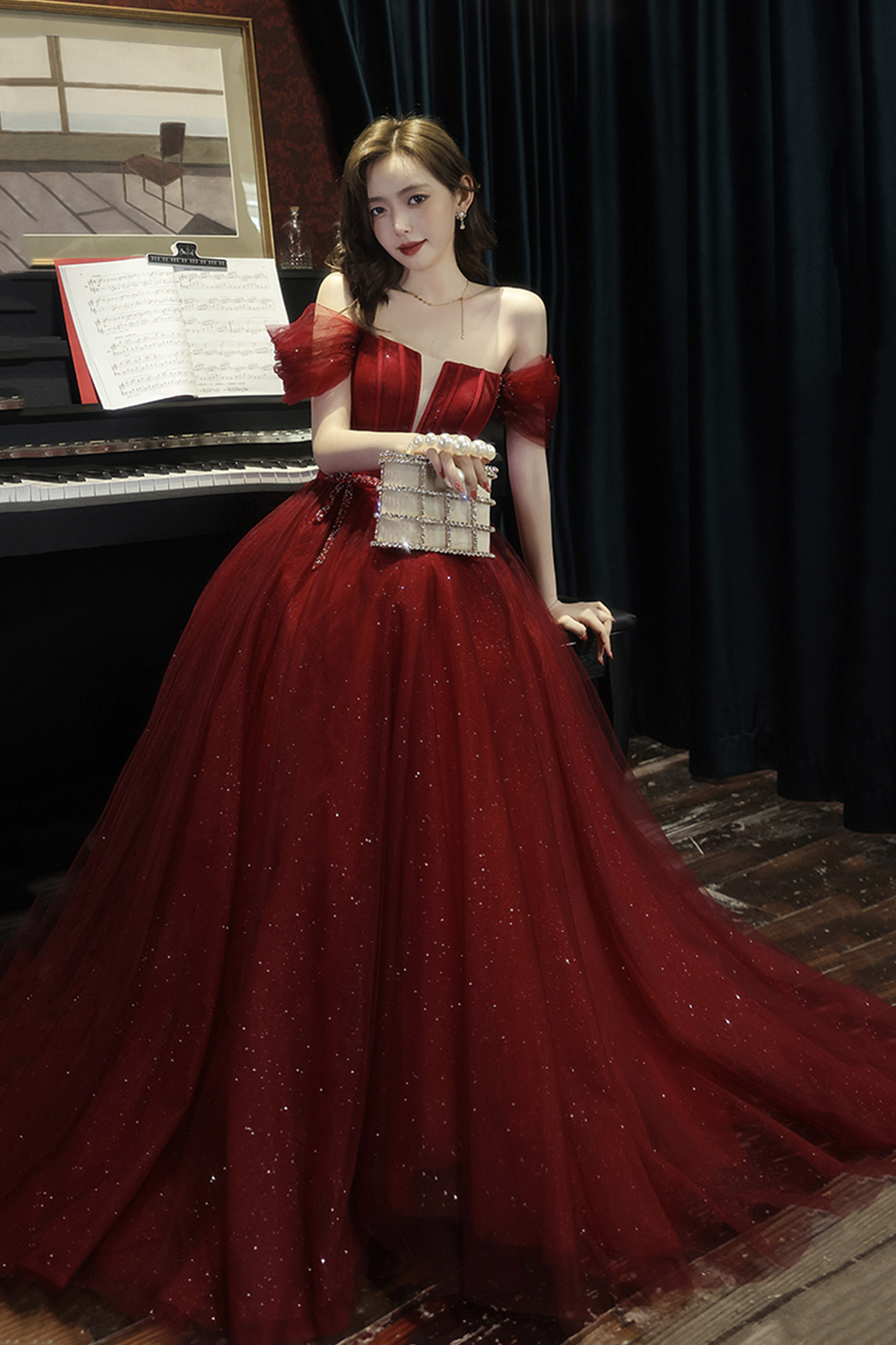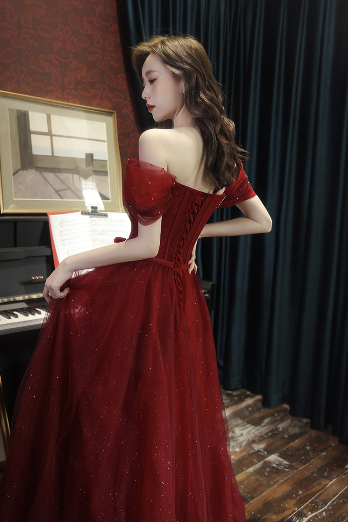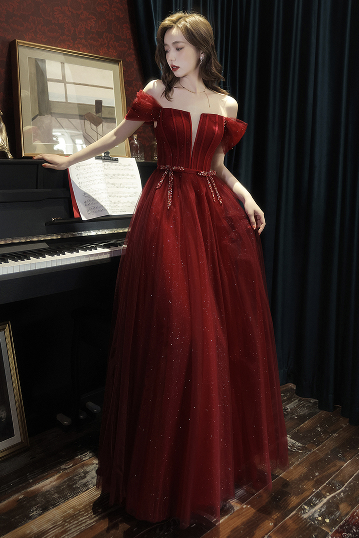 - Burgundy tulle long A line prom dress evening dress -