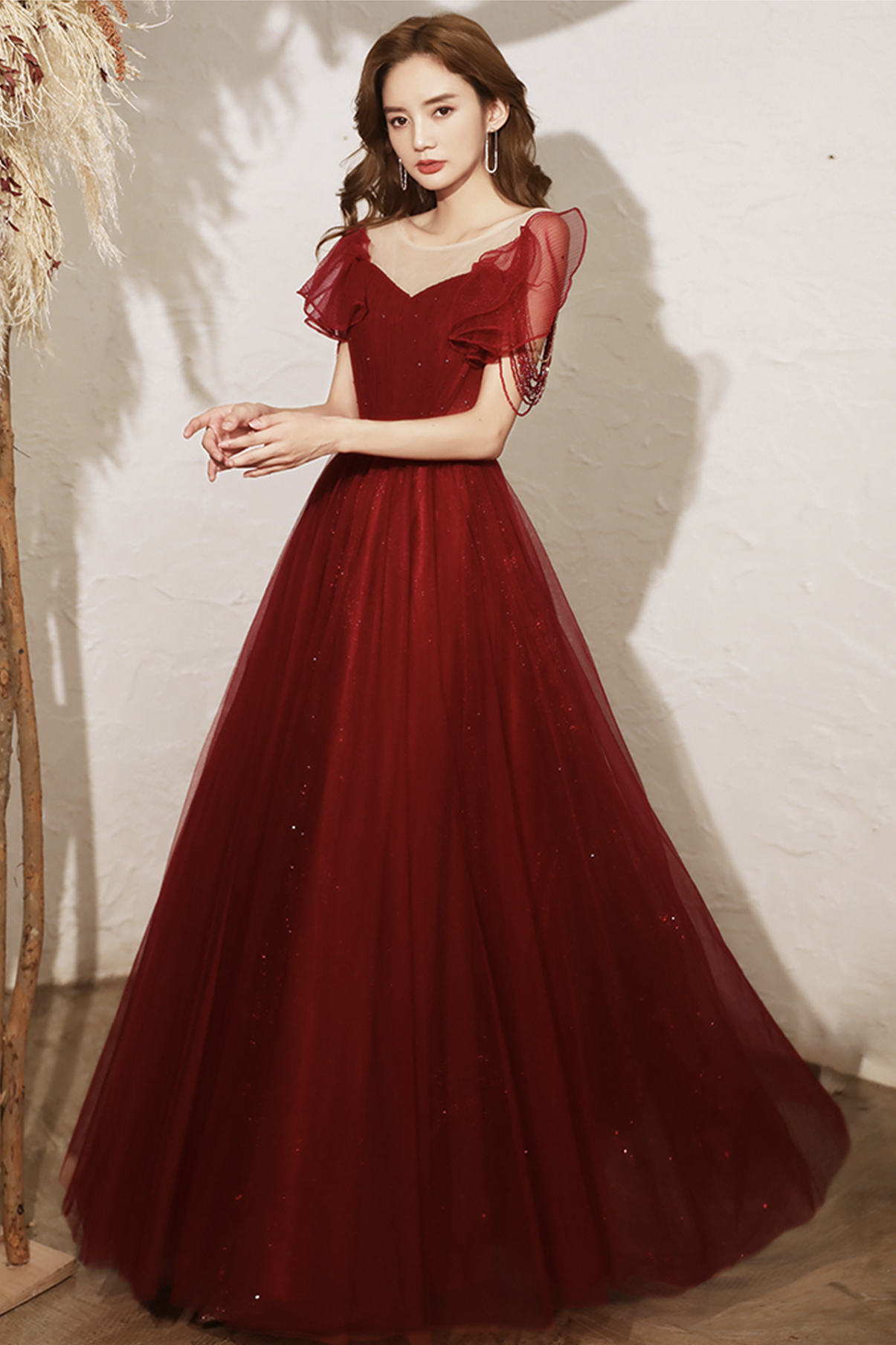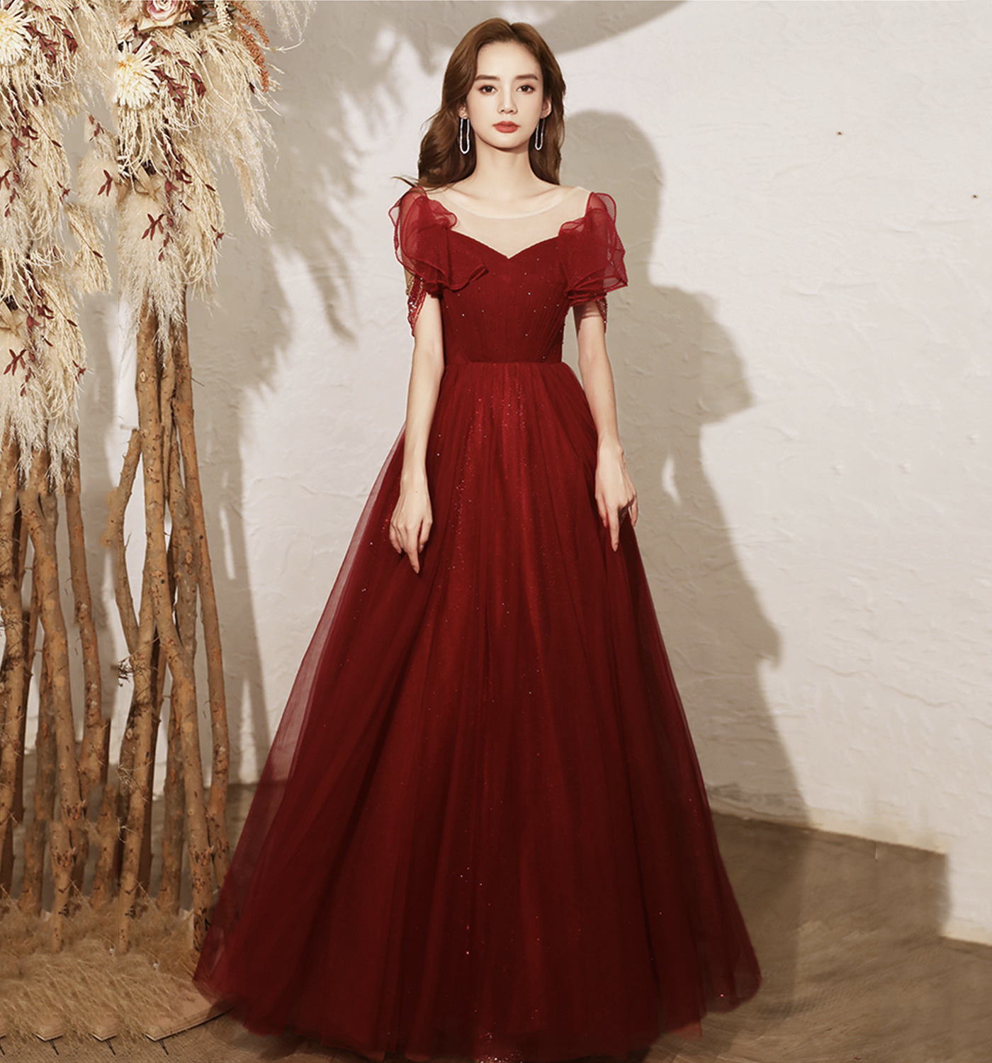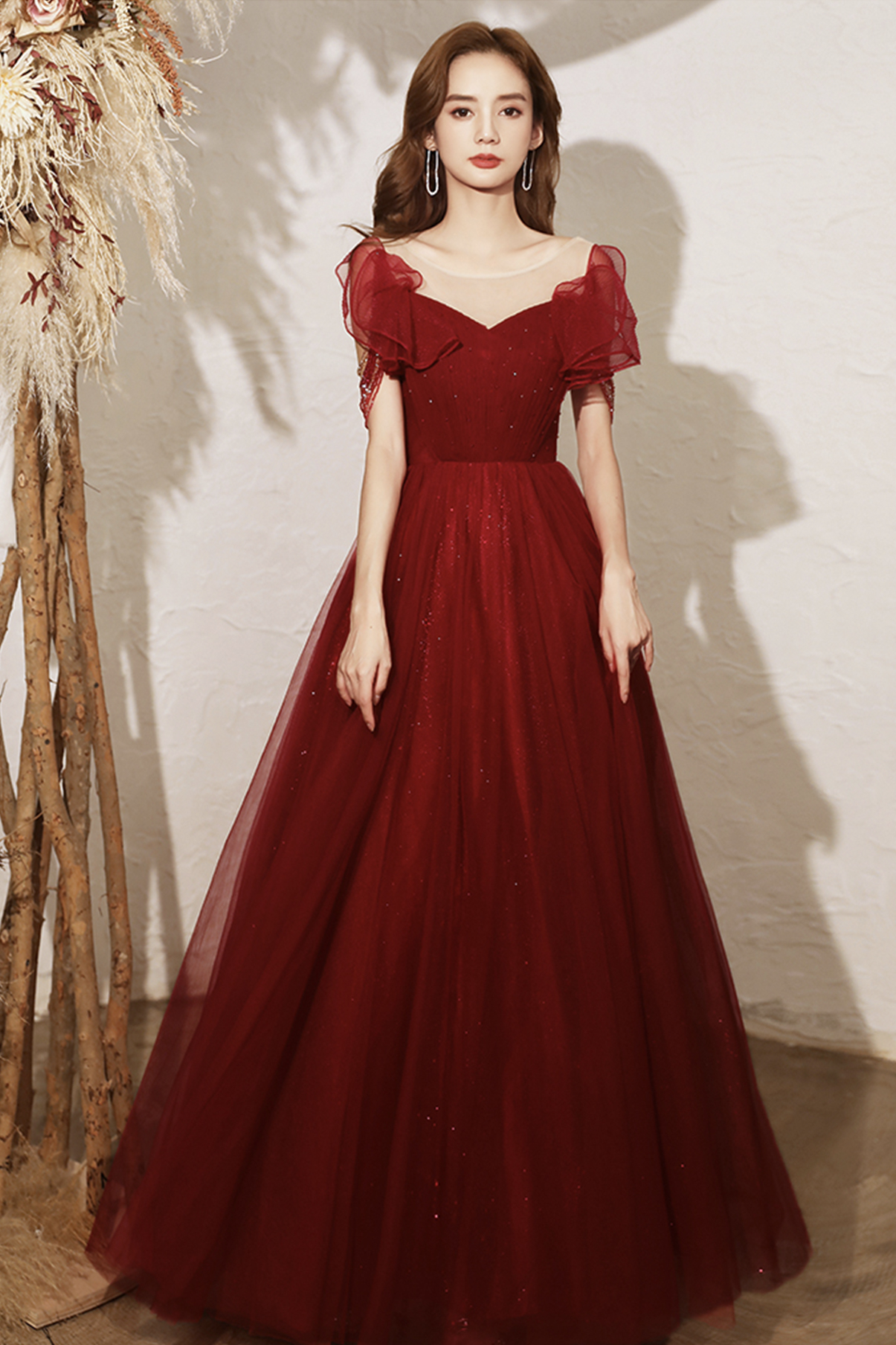 - Burgundy tulle long A line prom dress evening dress -