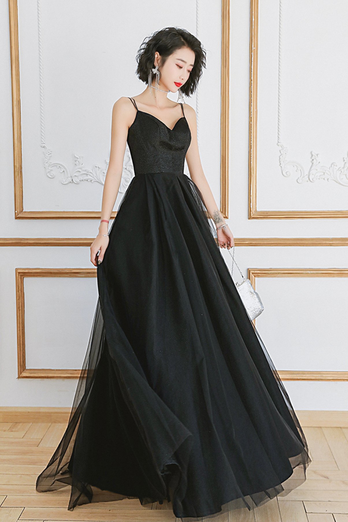 - Black tulle long A line prom dress evening dress -