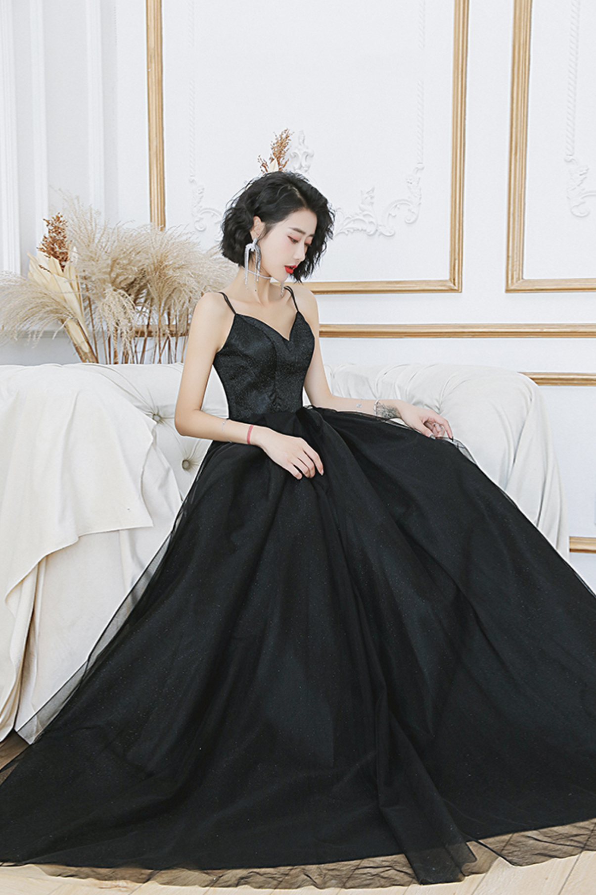 Black tulle long A line prom dress evening dress