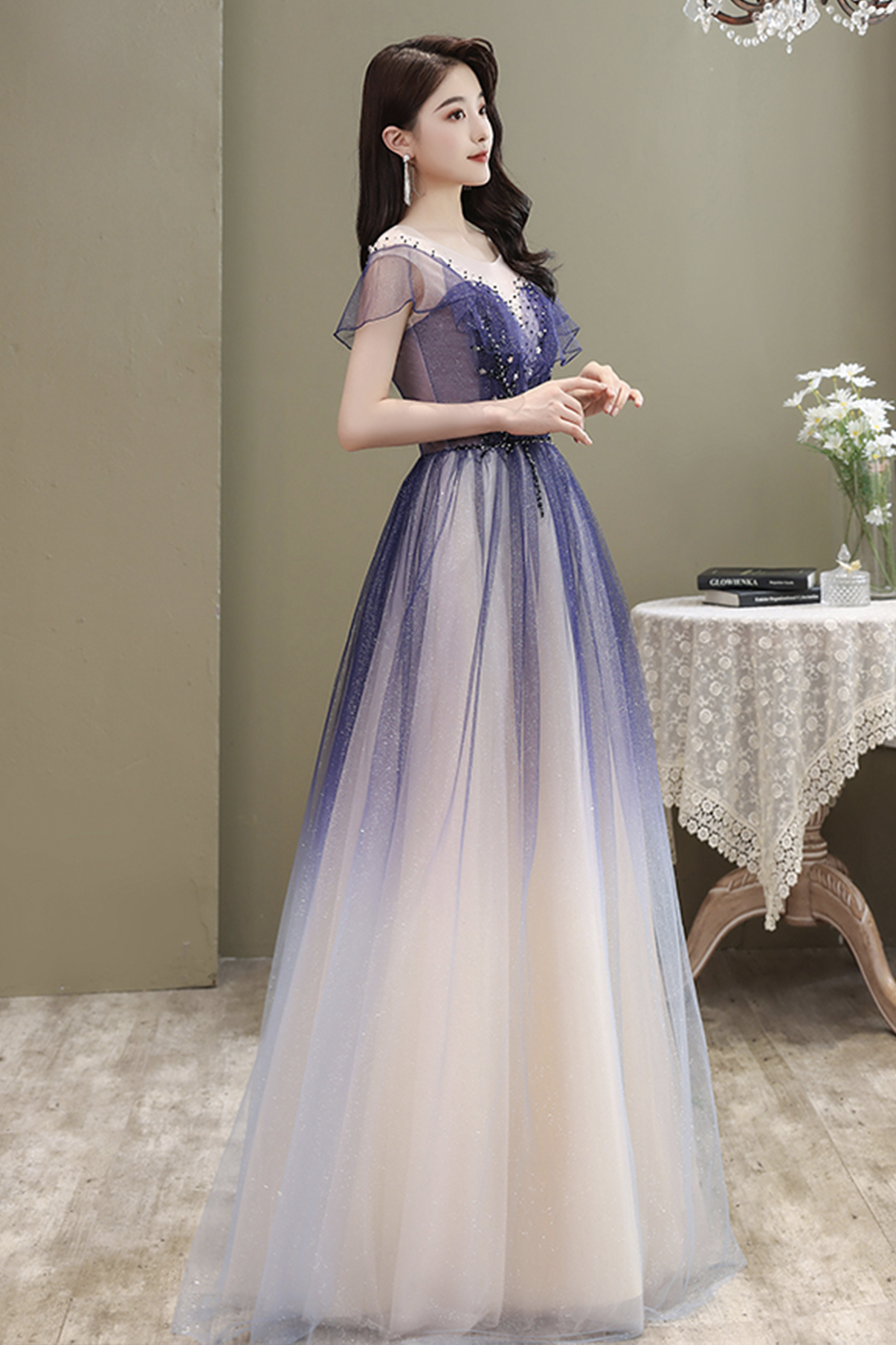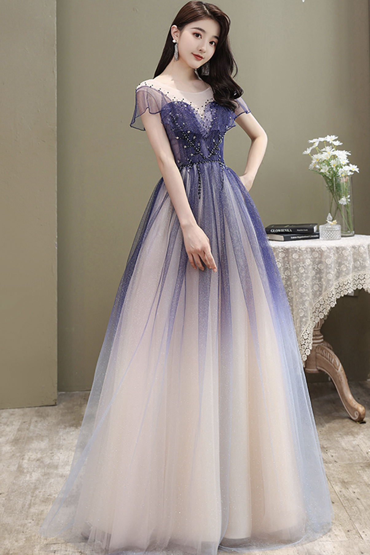 Cute tulle long A line prom dress cute evening dress
