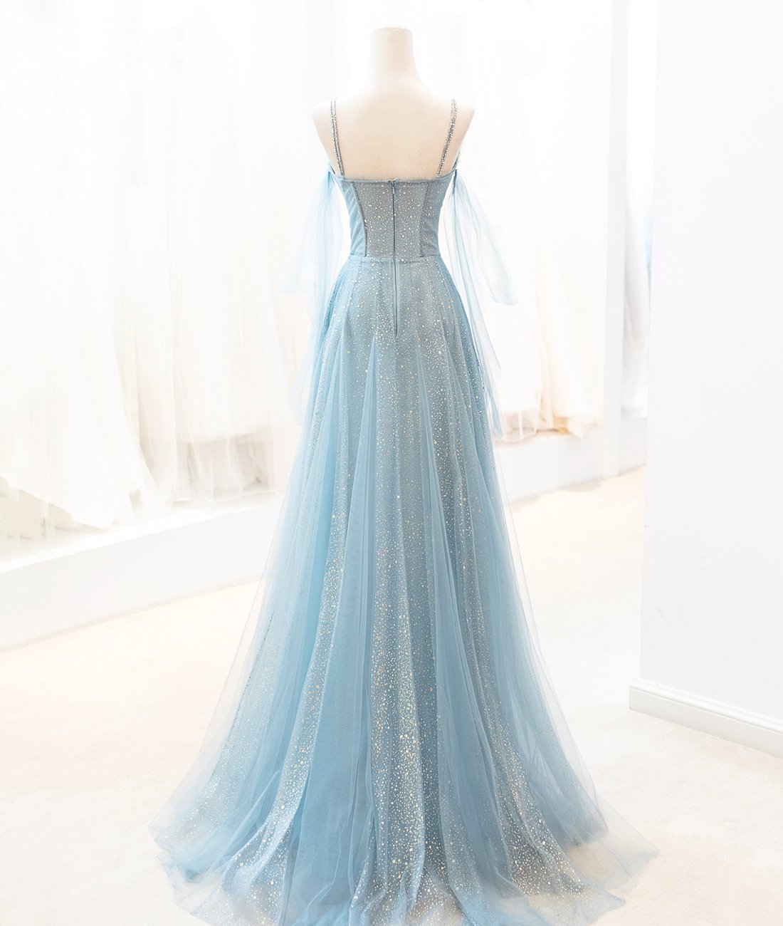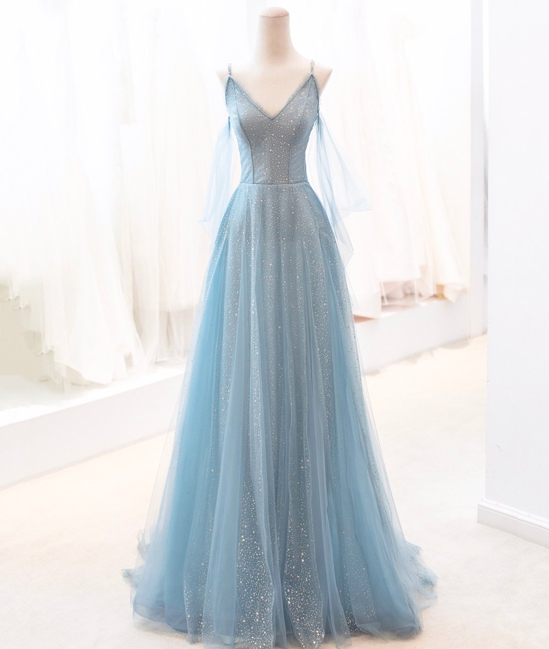 - Blue Tulle Long A Line Prom Dress Blue Evening Dress -