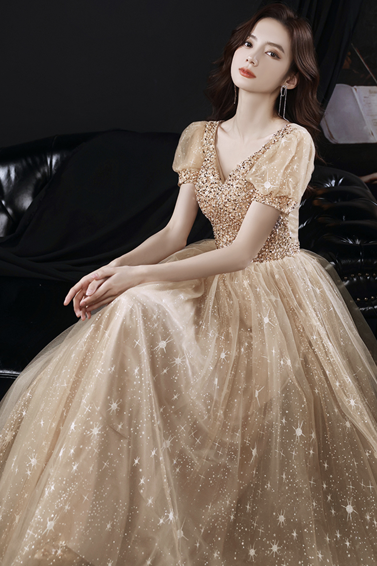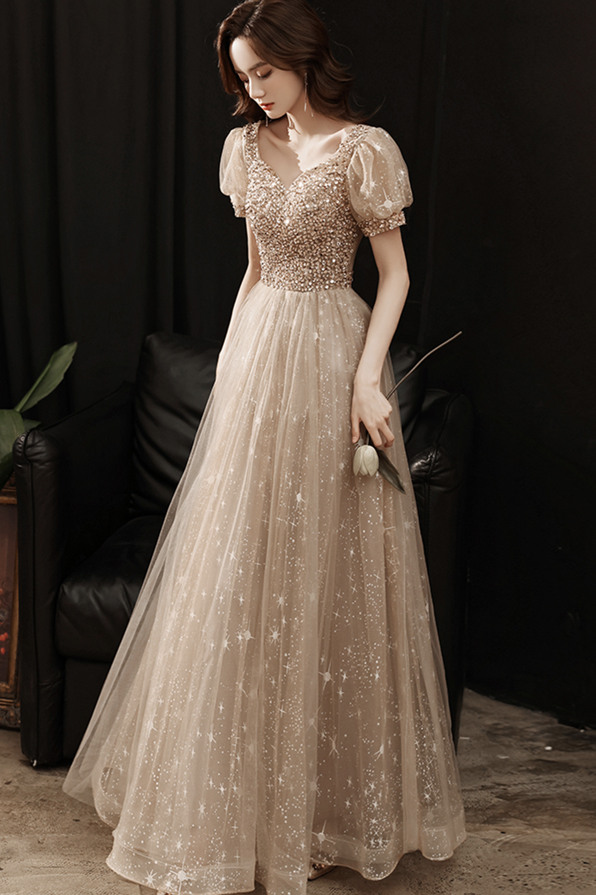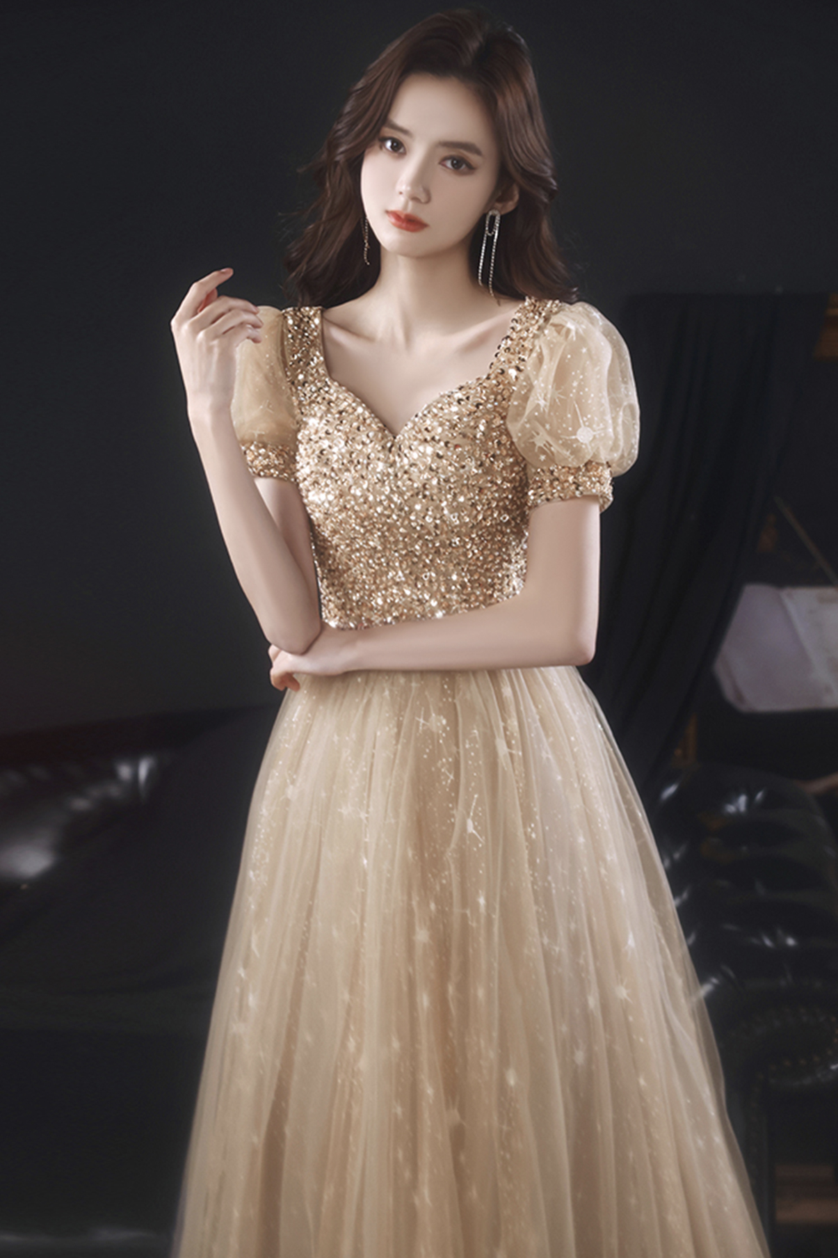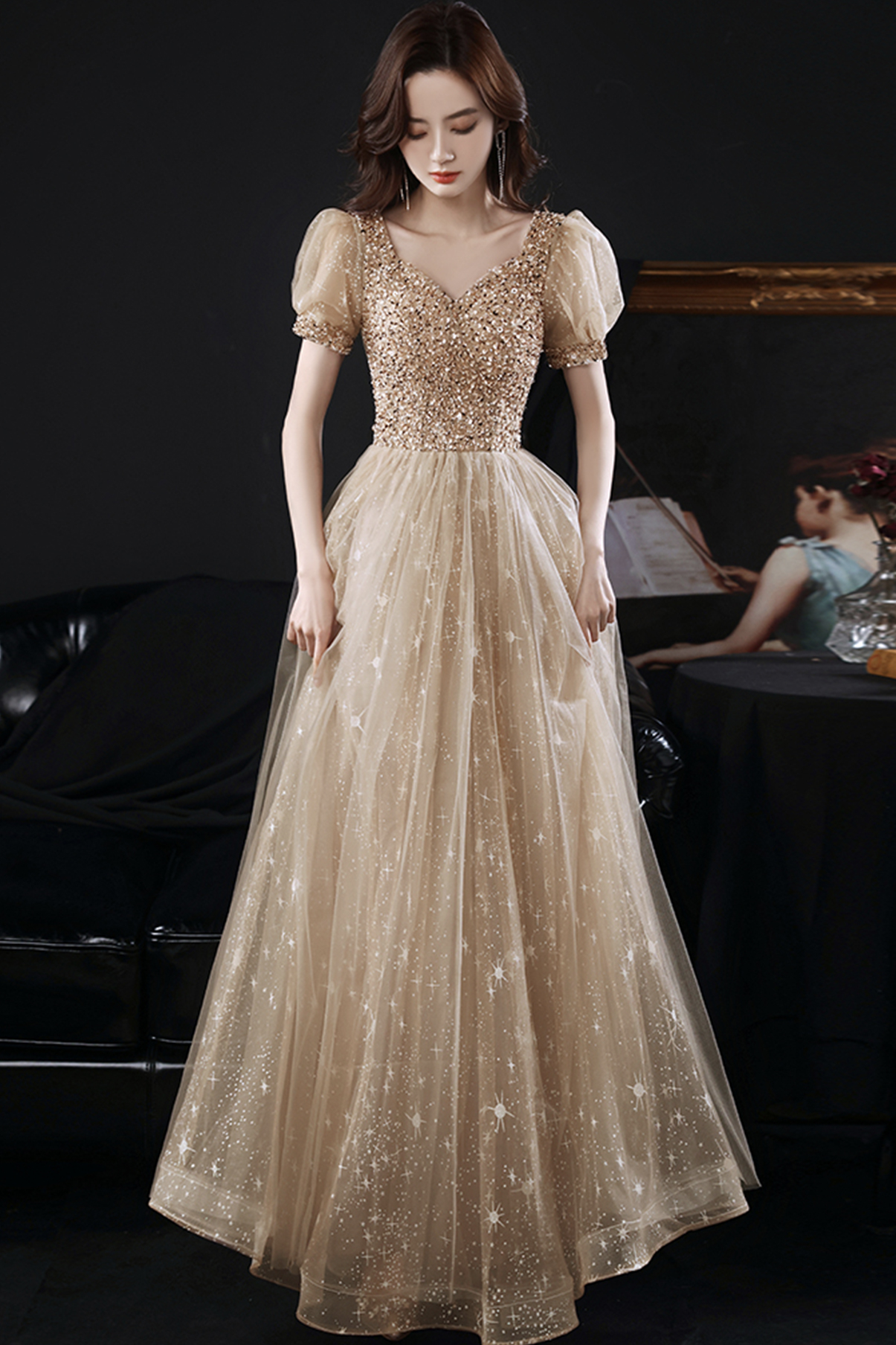 - Gold tulle beads long A line prom dress evening dress -
