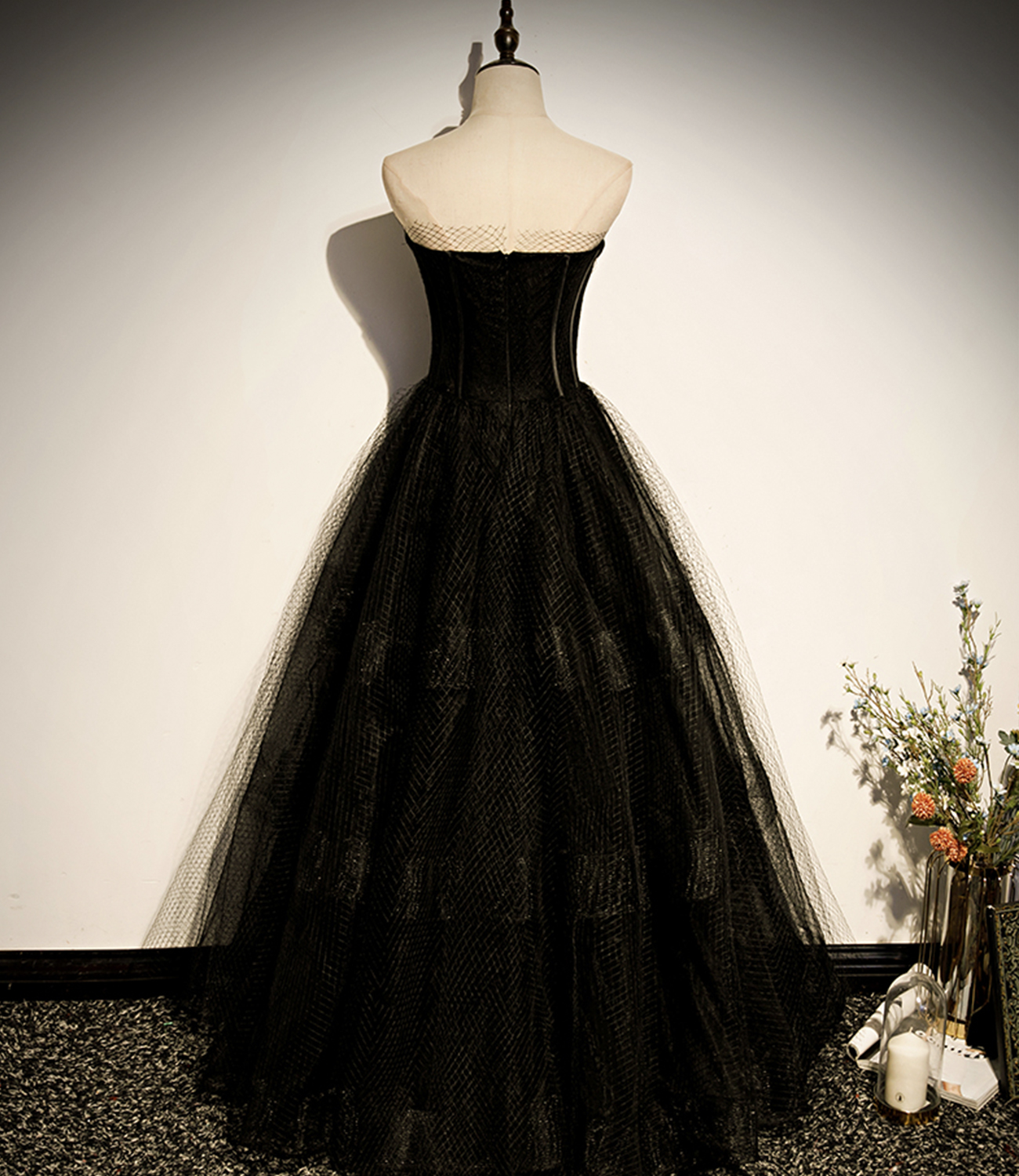 - Black tulle long A line prom dress black evening dress -