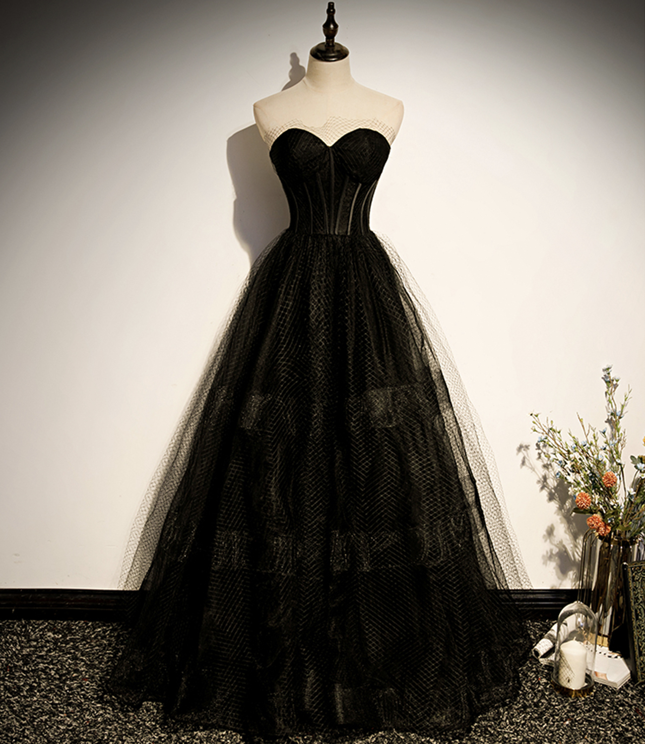 Black tulle long A line prom dress black evening dress