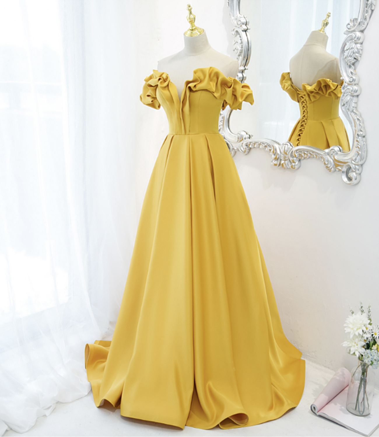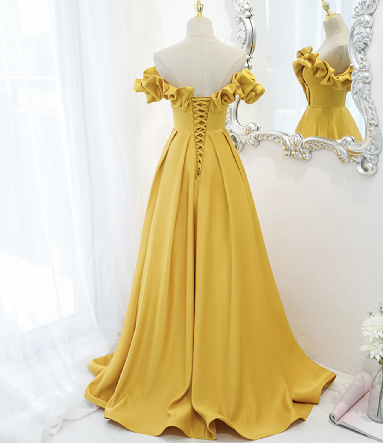 Yellow satin long A line prom dress evening dress