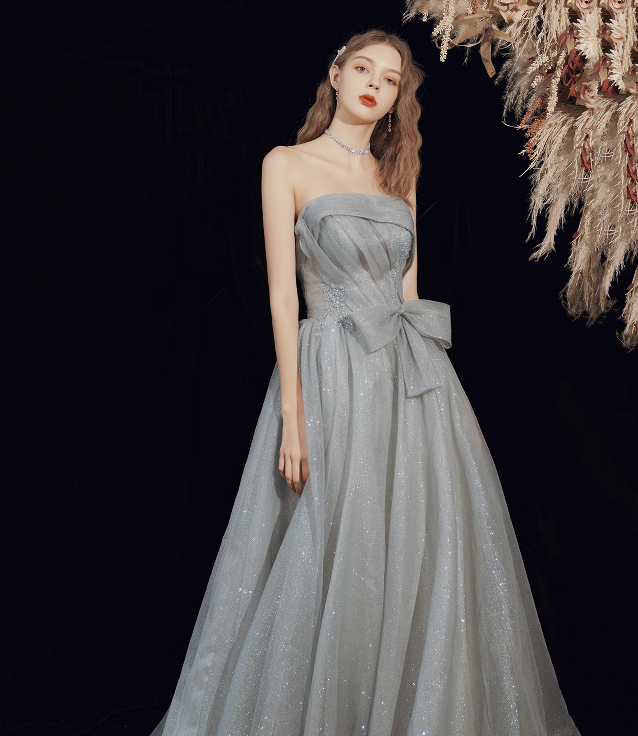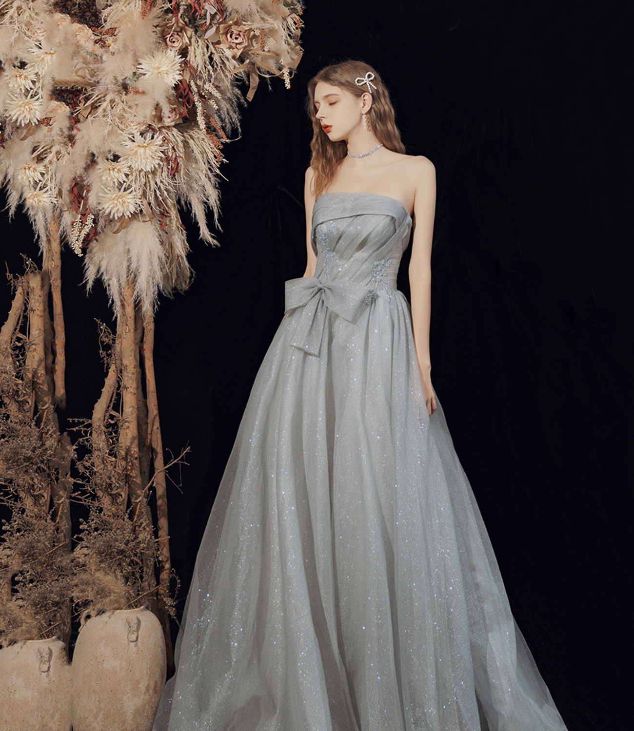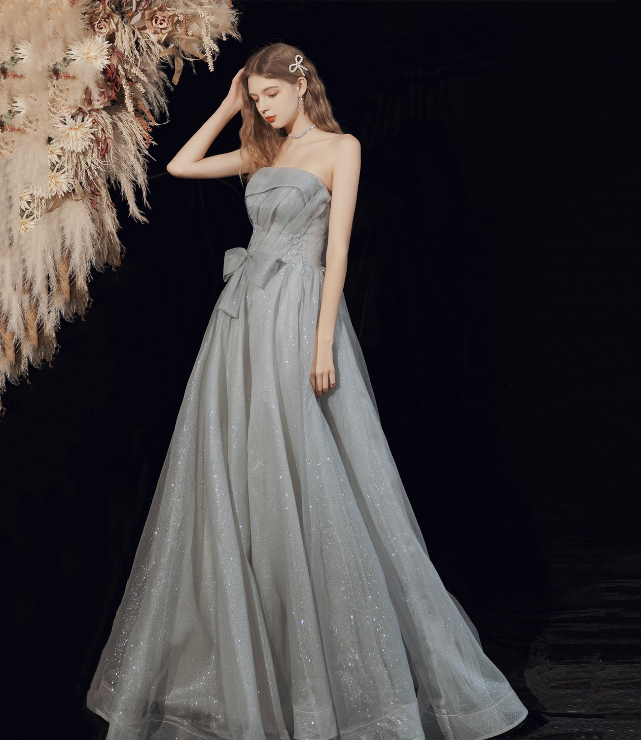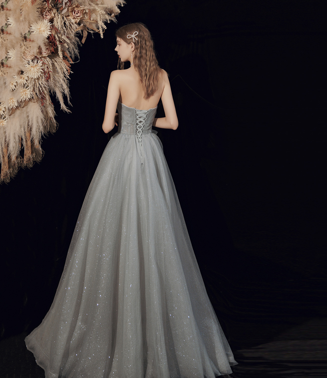 - Gray tulle long A line prom dress gray evening dress -
