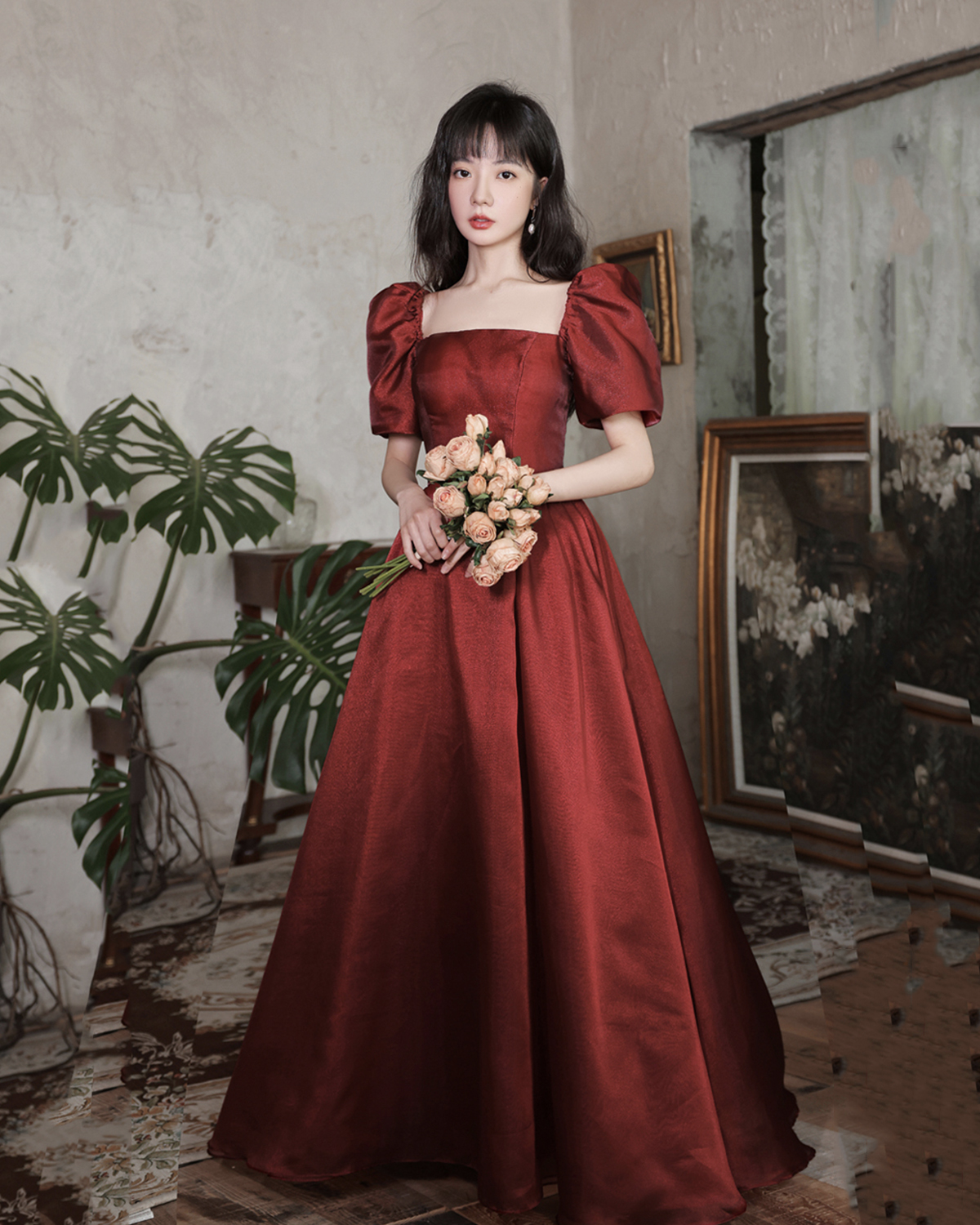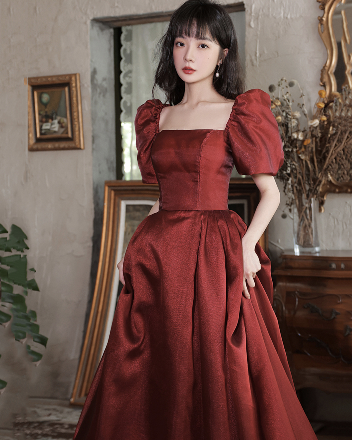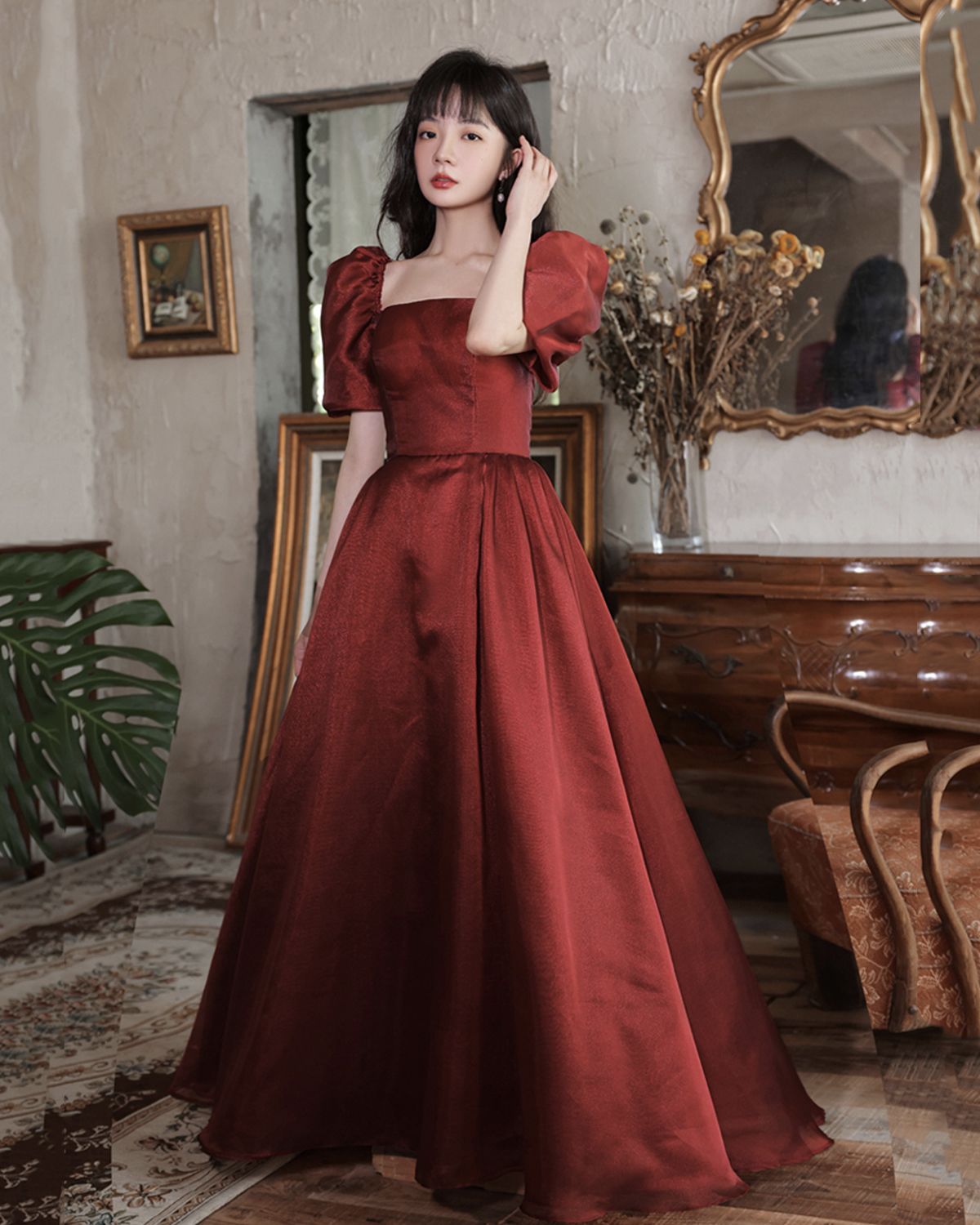 - Burgundy satin long A line prom dress homecoming dress -