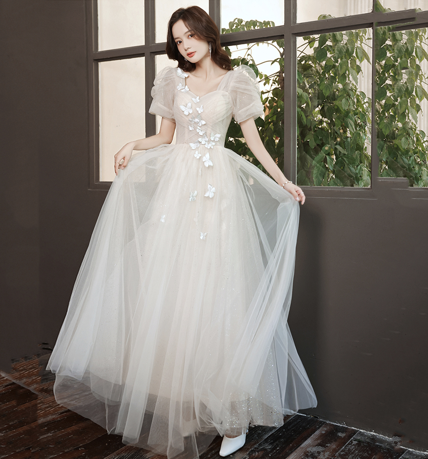 - Champagne tulle long A line prom dress evening dress -