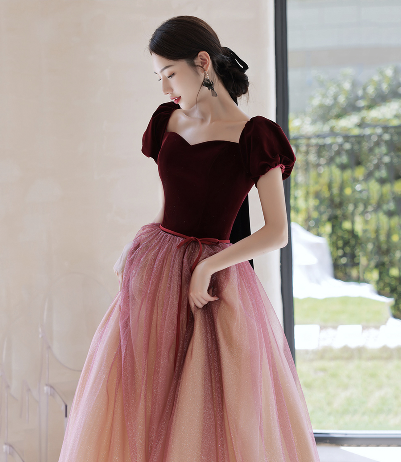- Burgundy velvet tulle long prom dress evening dress -