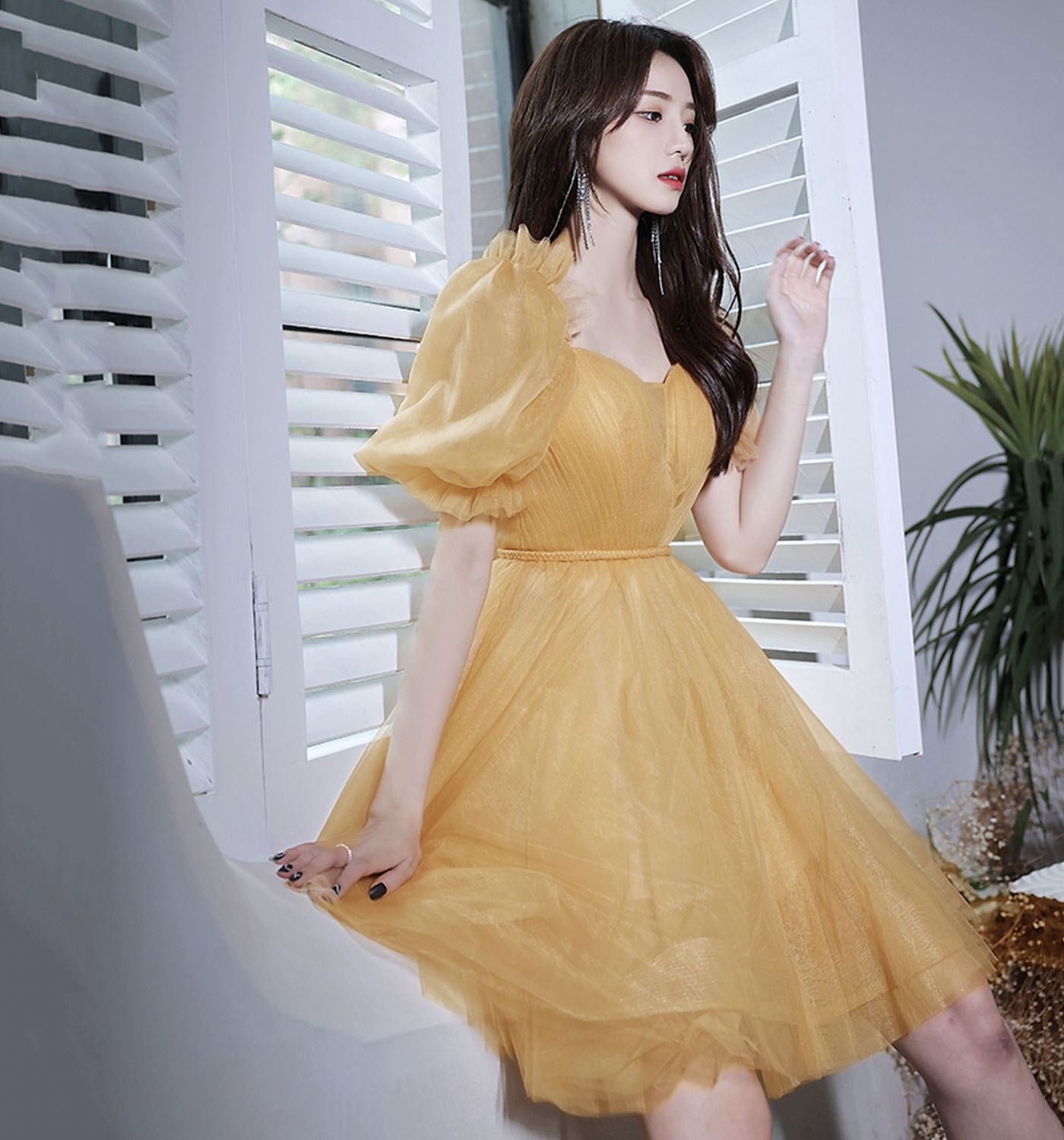 - Yellow tulle short prom dress party dress -