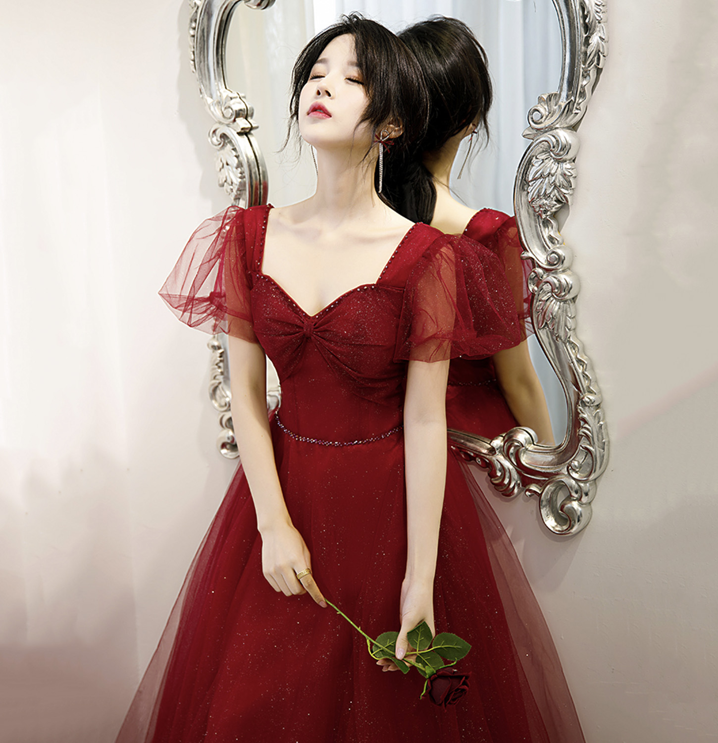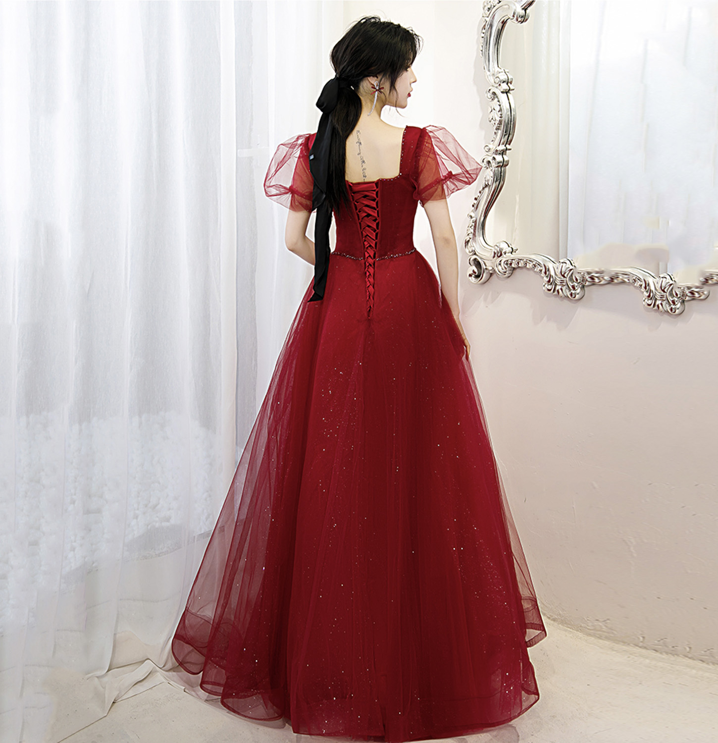 - Burgundy tulle long A line prom dress evening gown -