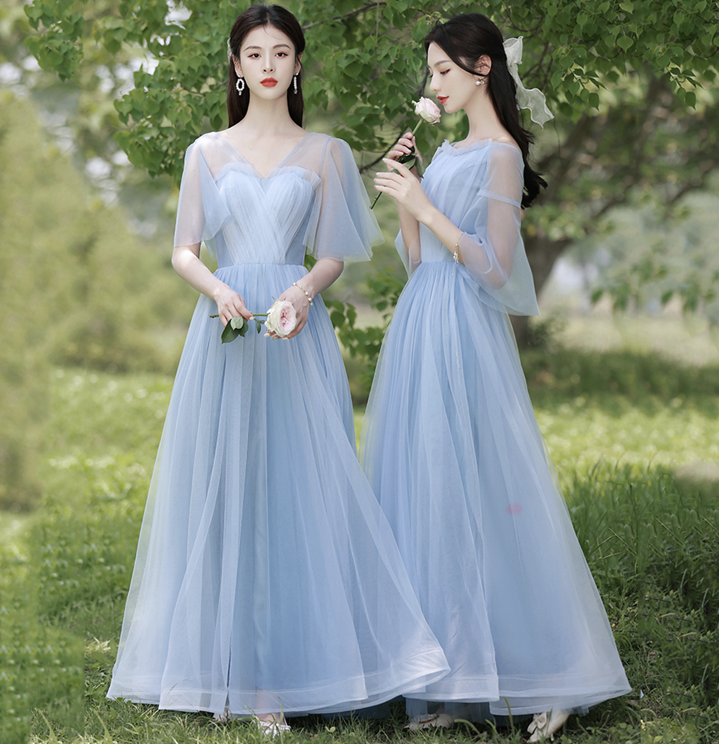 - Blue tulle long A line prom dress bridesmaid dress -
