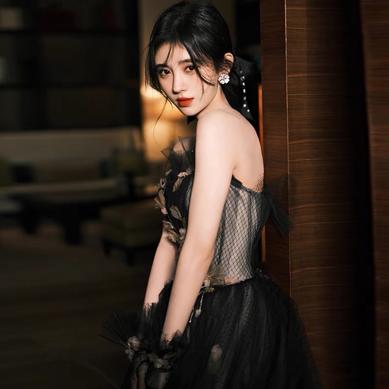 - Black tulle long ball gown dress A line evening gown -