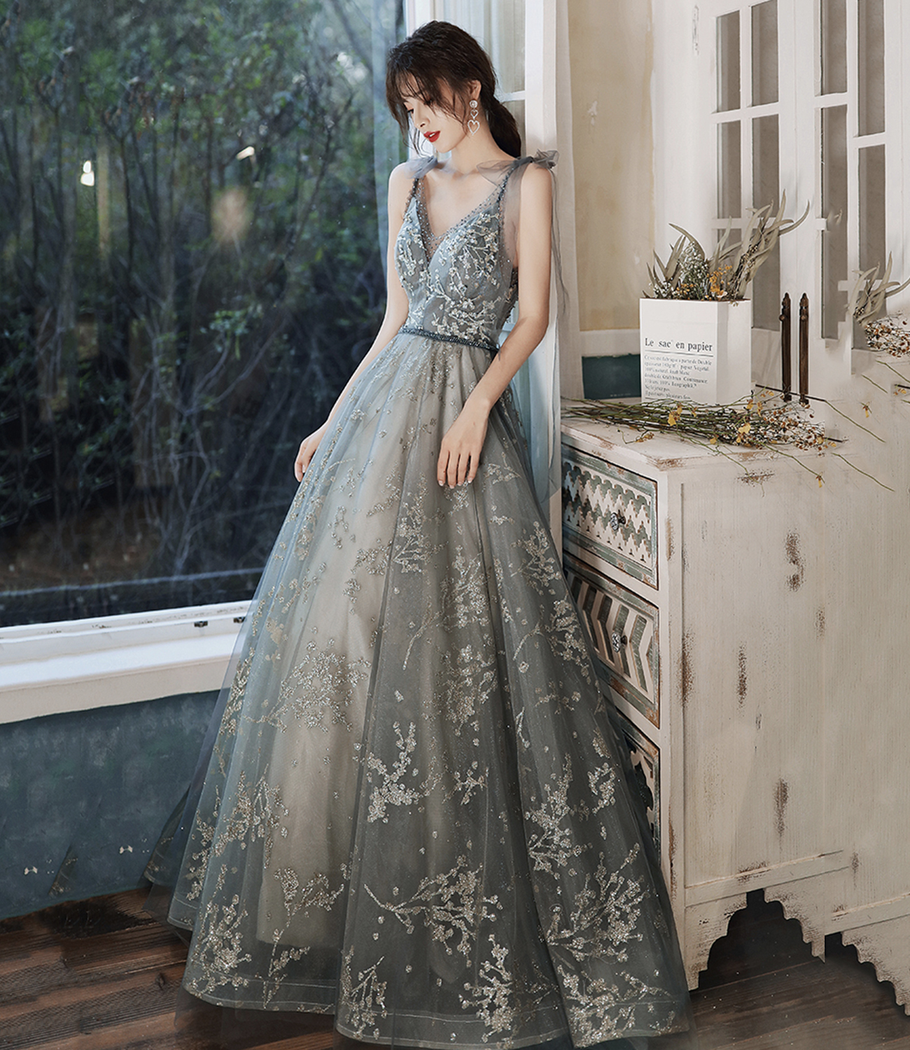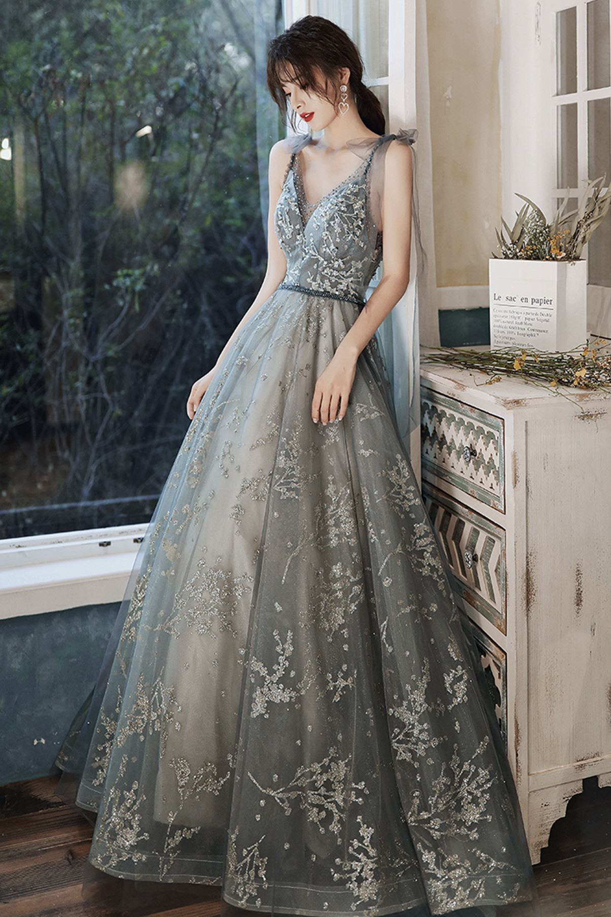 - Gray Tulle Sequins Long Prom Dress Evening Gown -