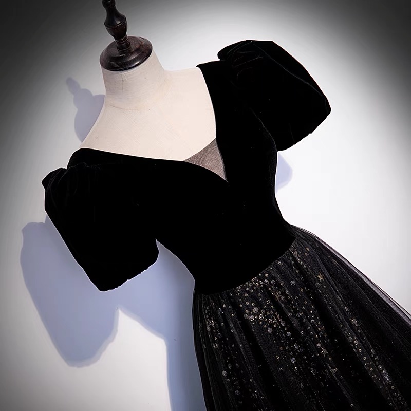 - Black velvet tulle long prom dress A line evening gown -