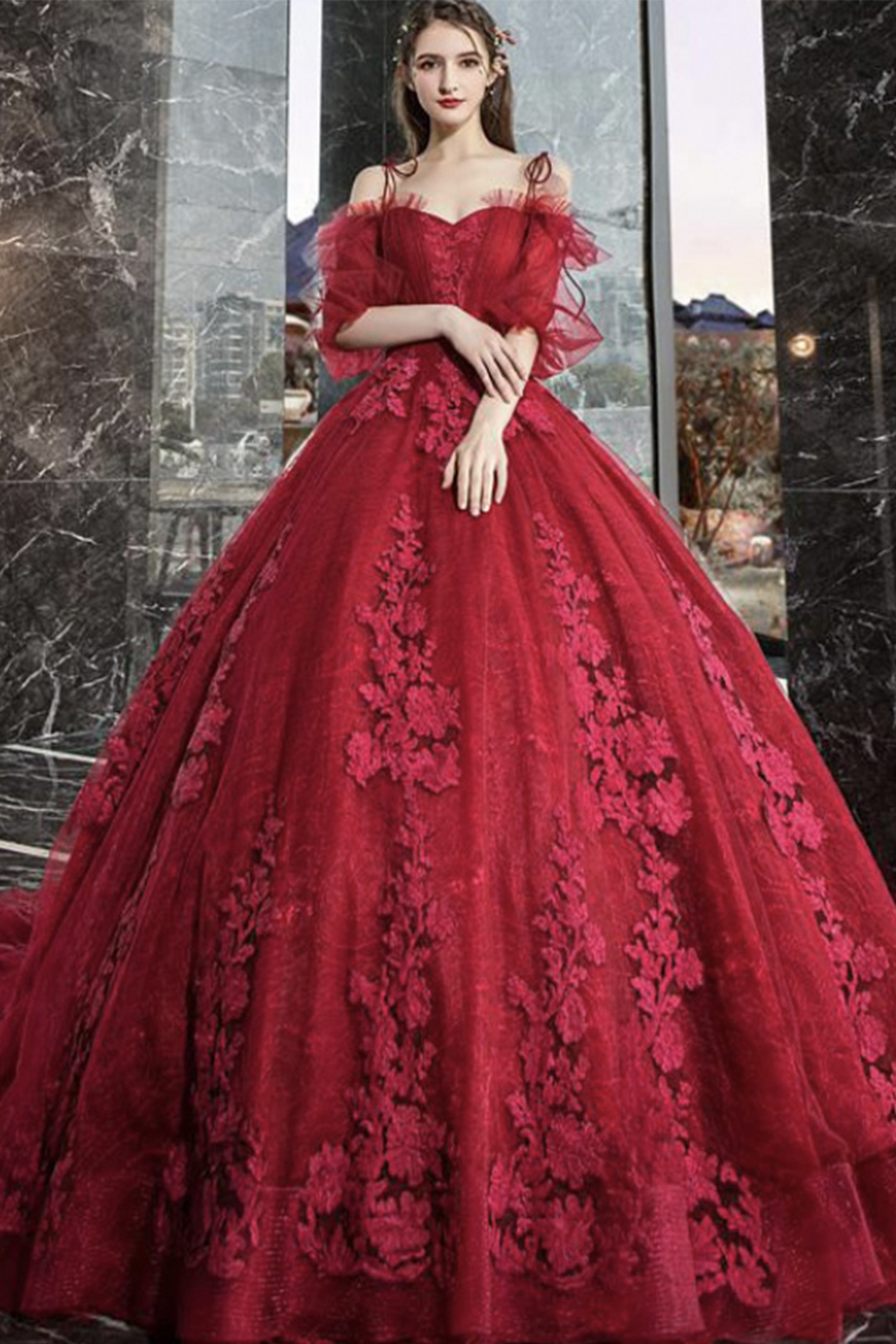 - Burgundy lace long A line ball gown dress formal dress -