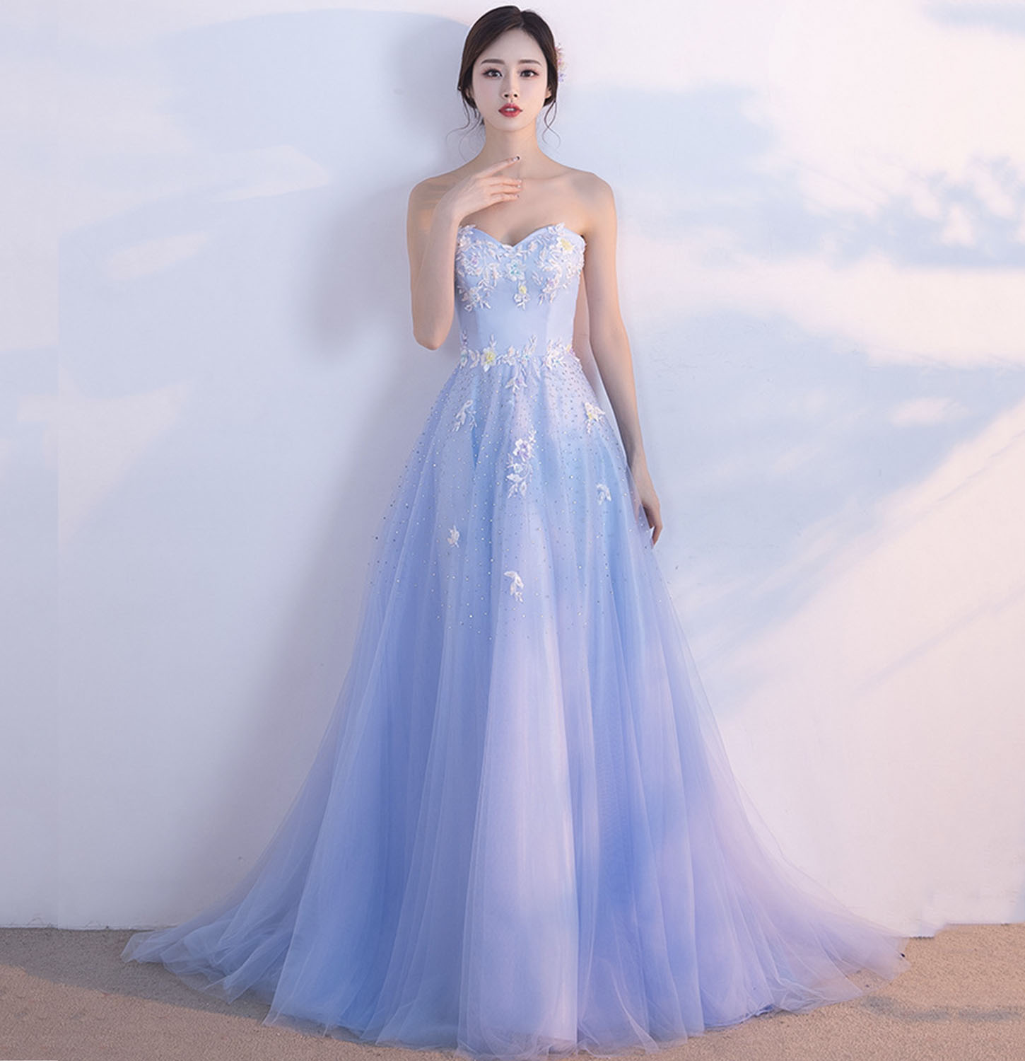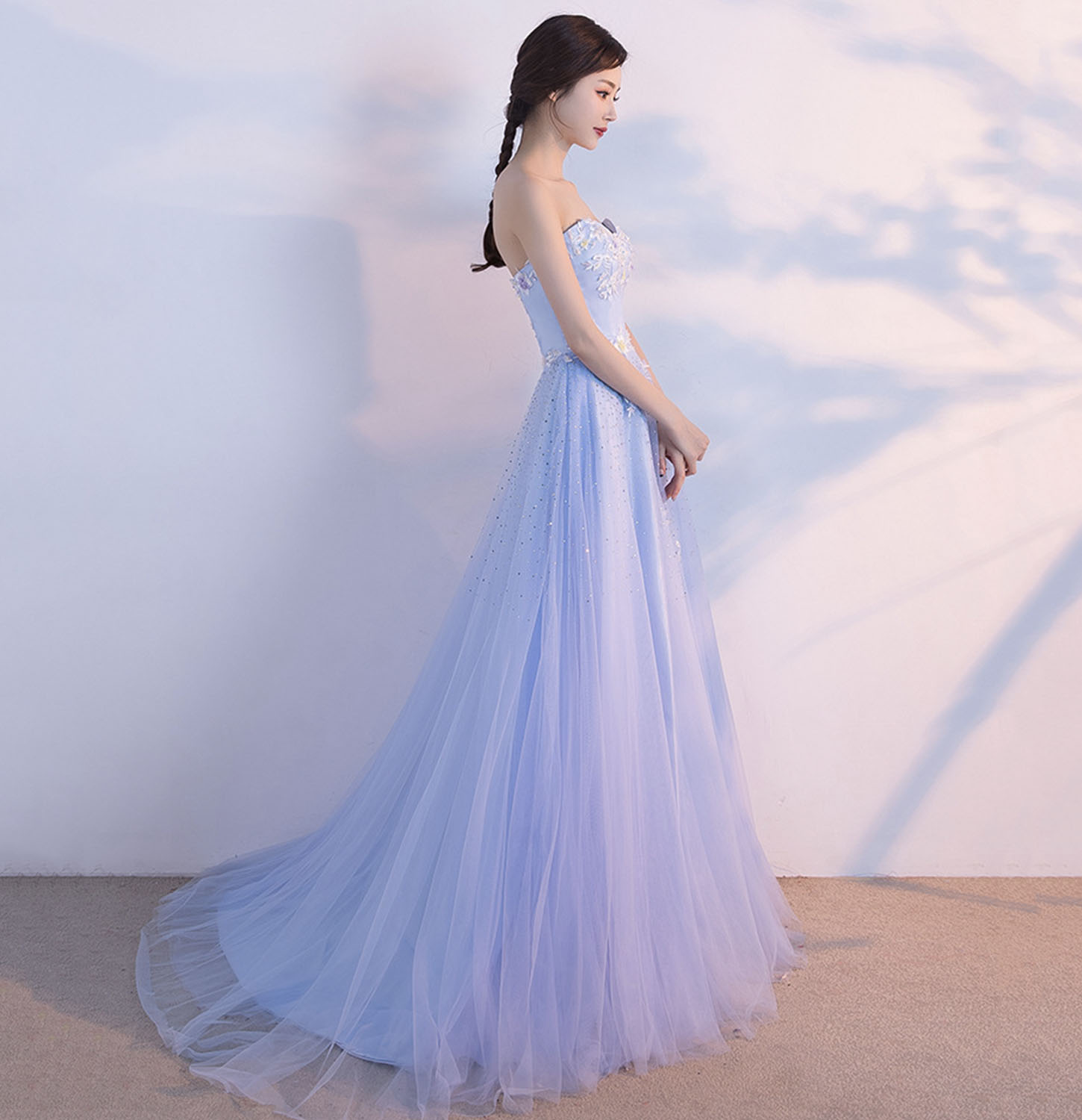 - Blue tulle lace long prom dress blue evening gown -