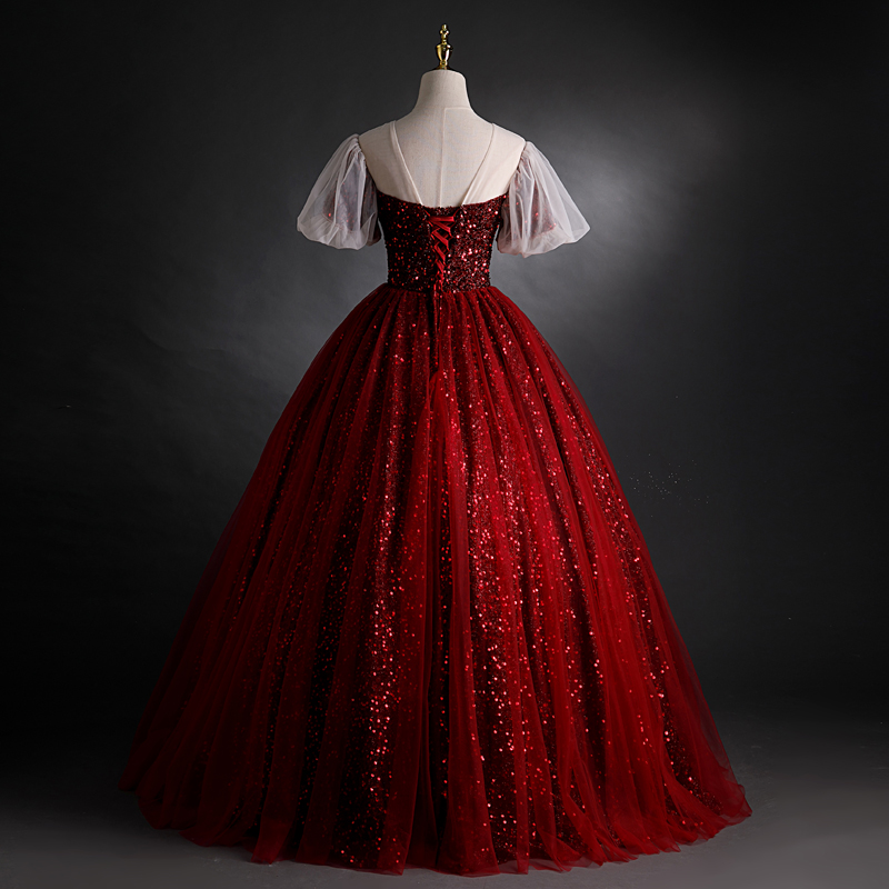 - Burgundy sequins long prom dress A line evening gown -