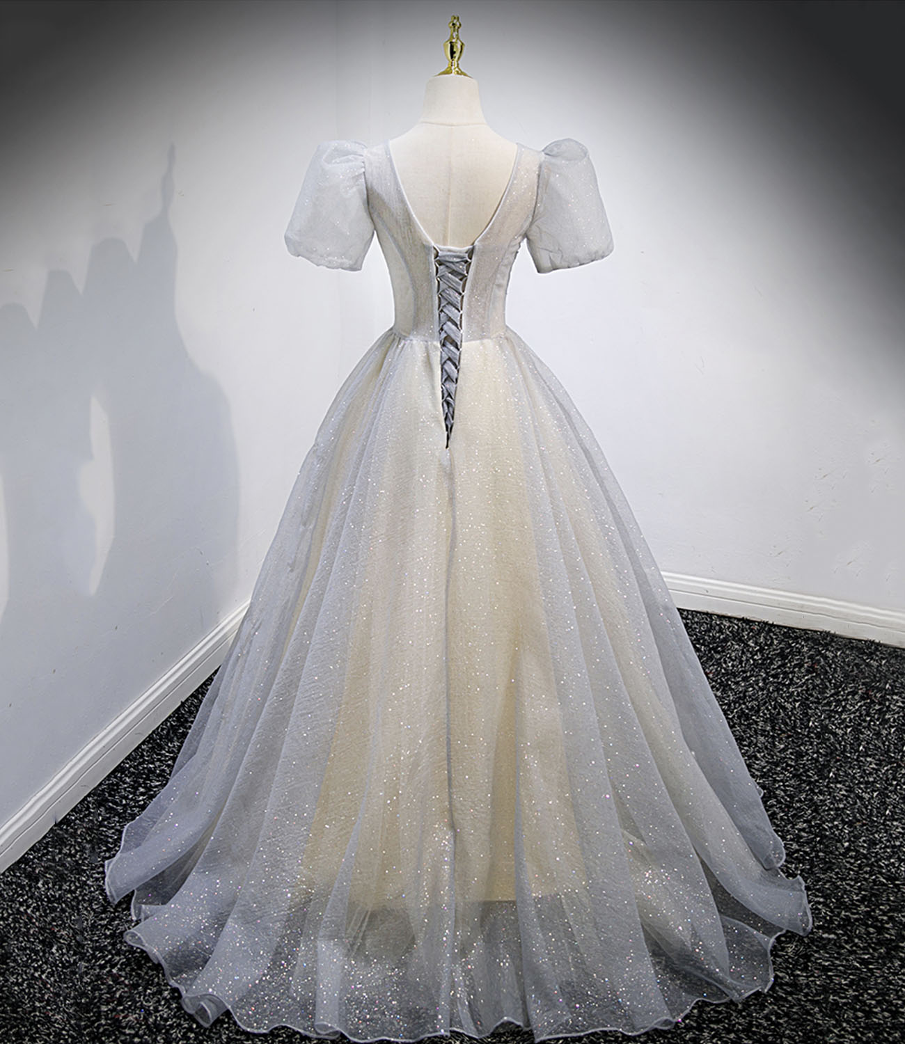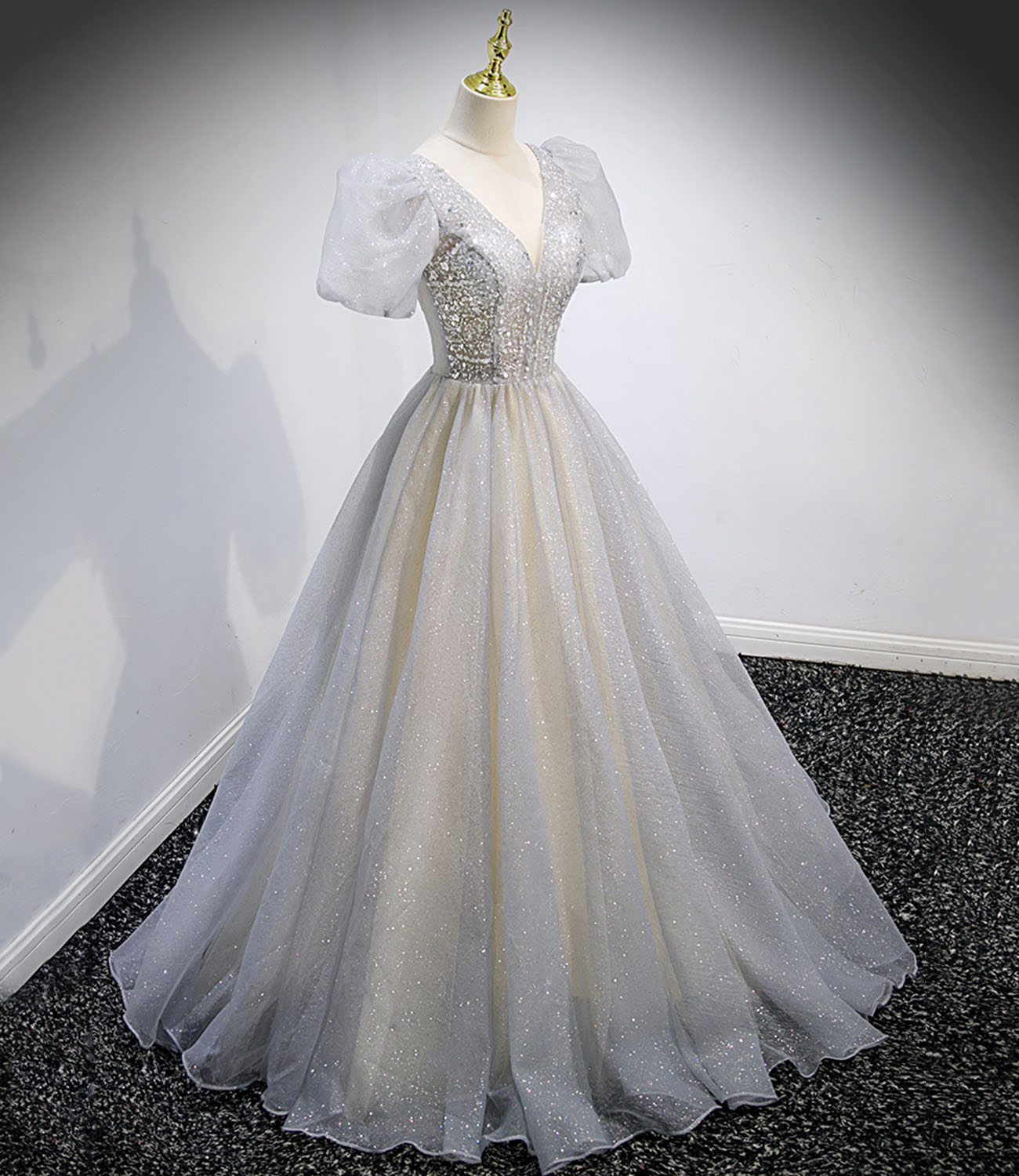 - Gray tulle sequins long prom dress gray evening dress -