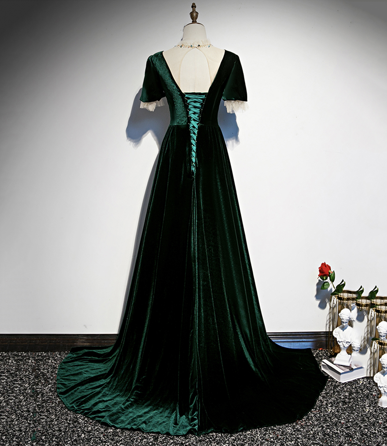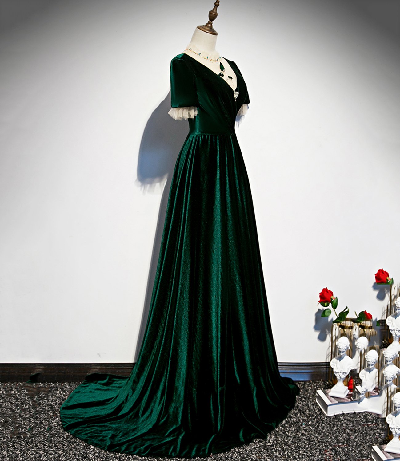 - Green velvet long A line prom dress evening dress -