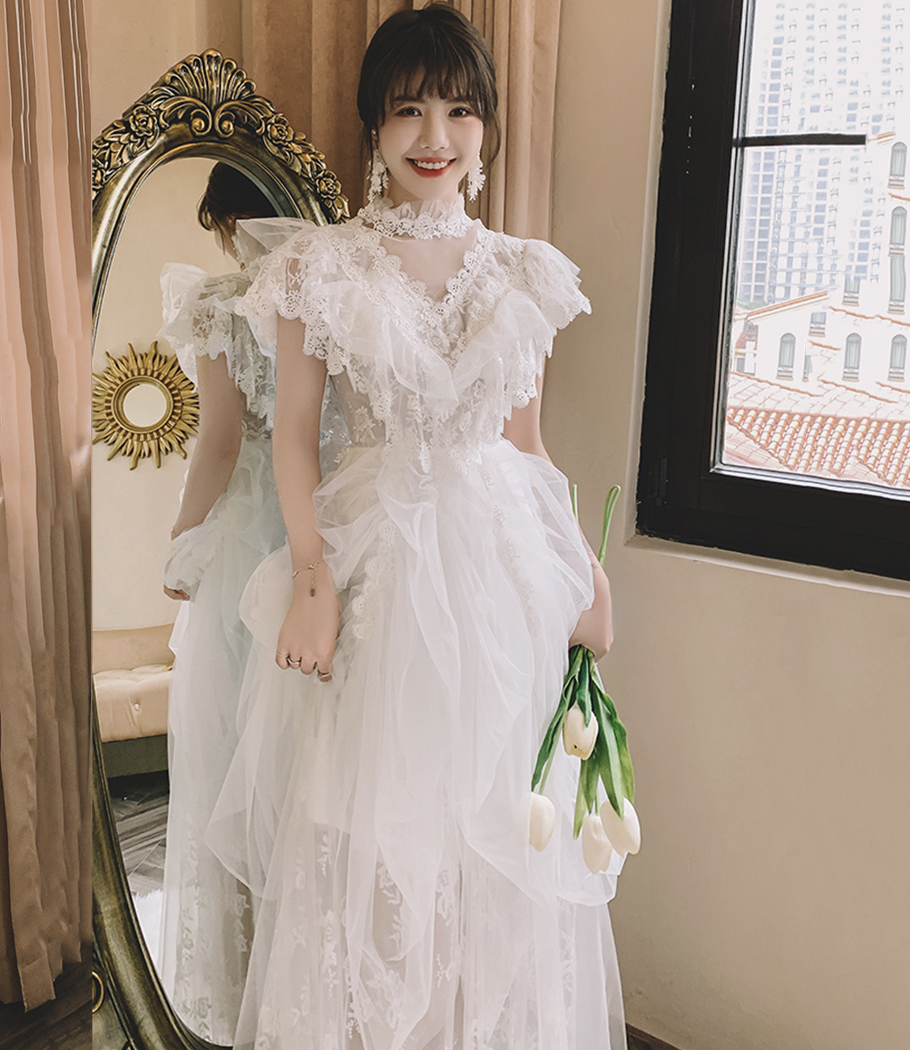 White tulle lace long prom dress evening dress