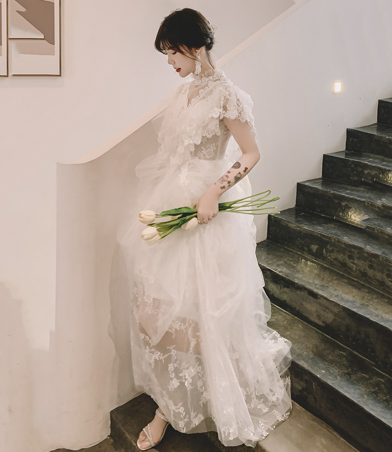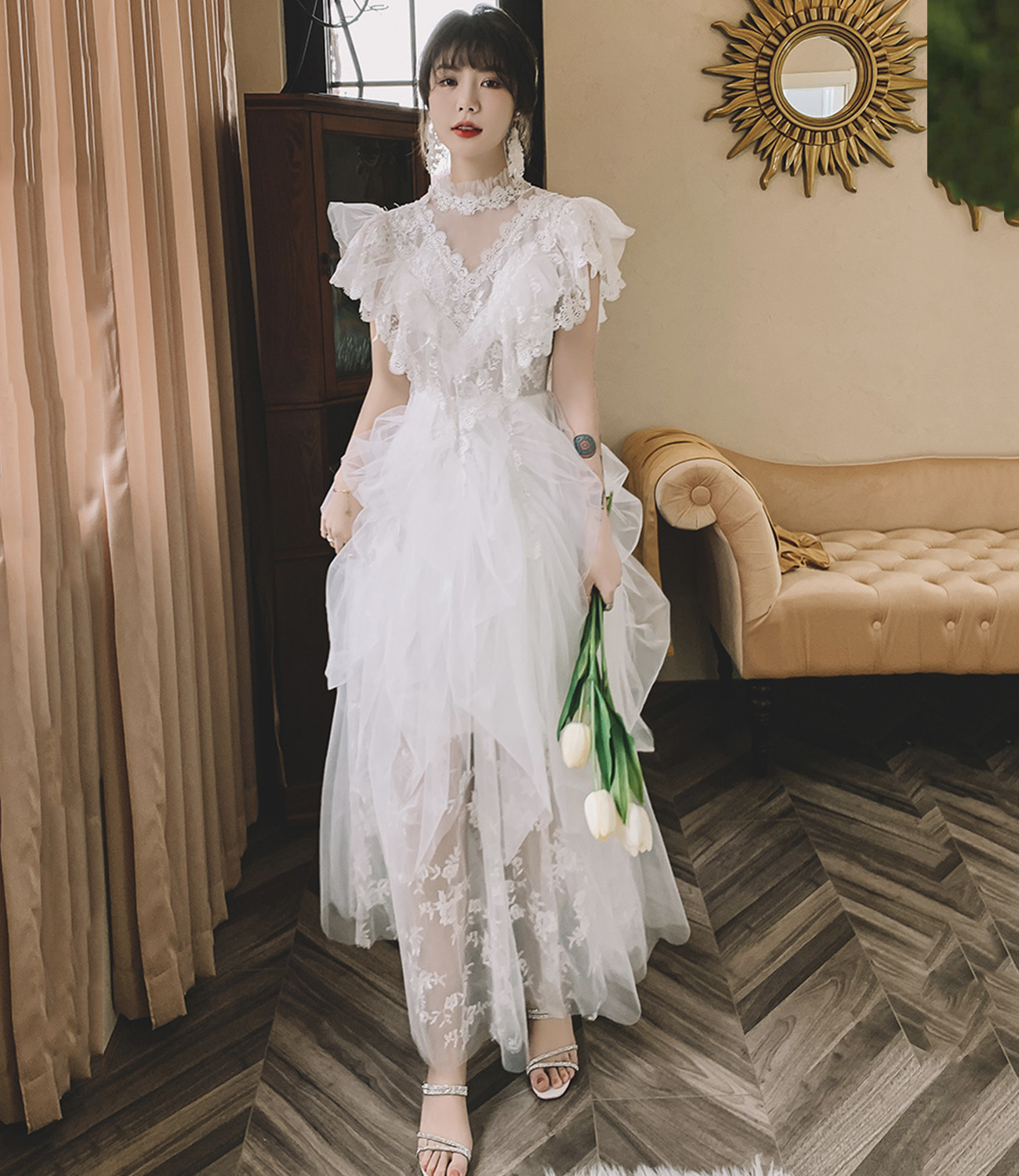- White tulle lace long prom dress evening dress -