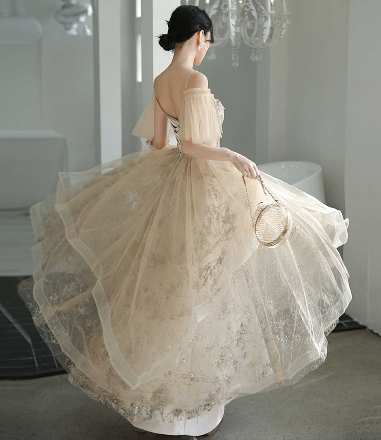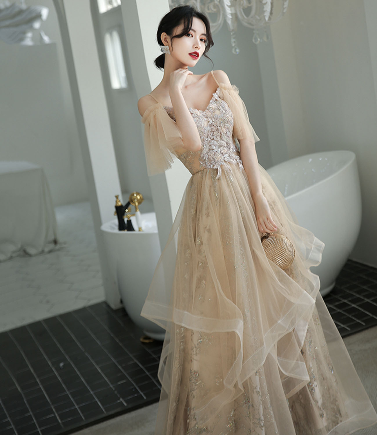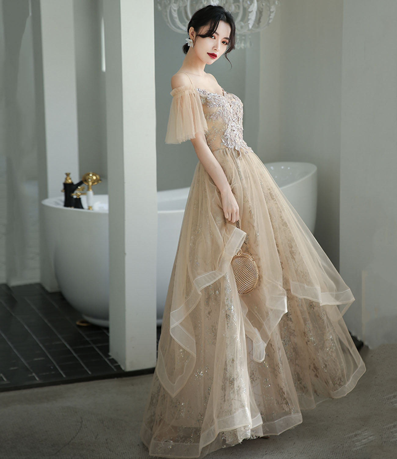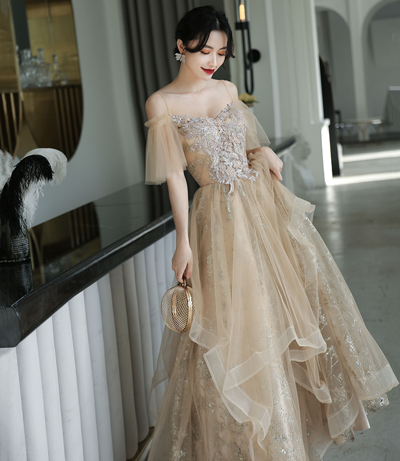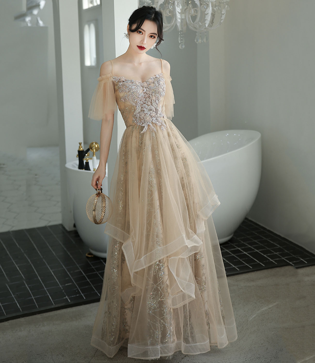 - Champagne tulle lace long prom dress A line evening dress -