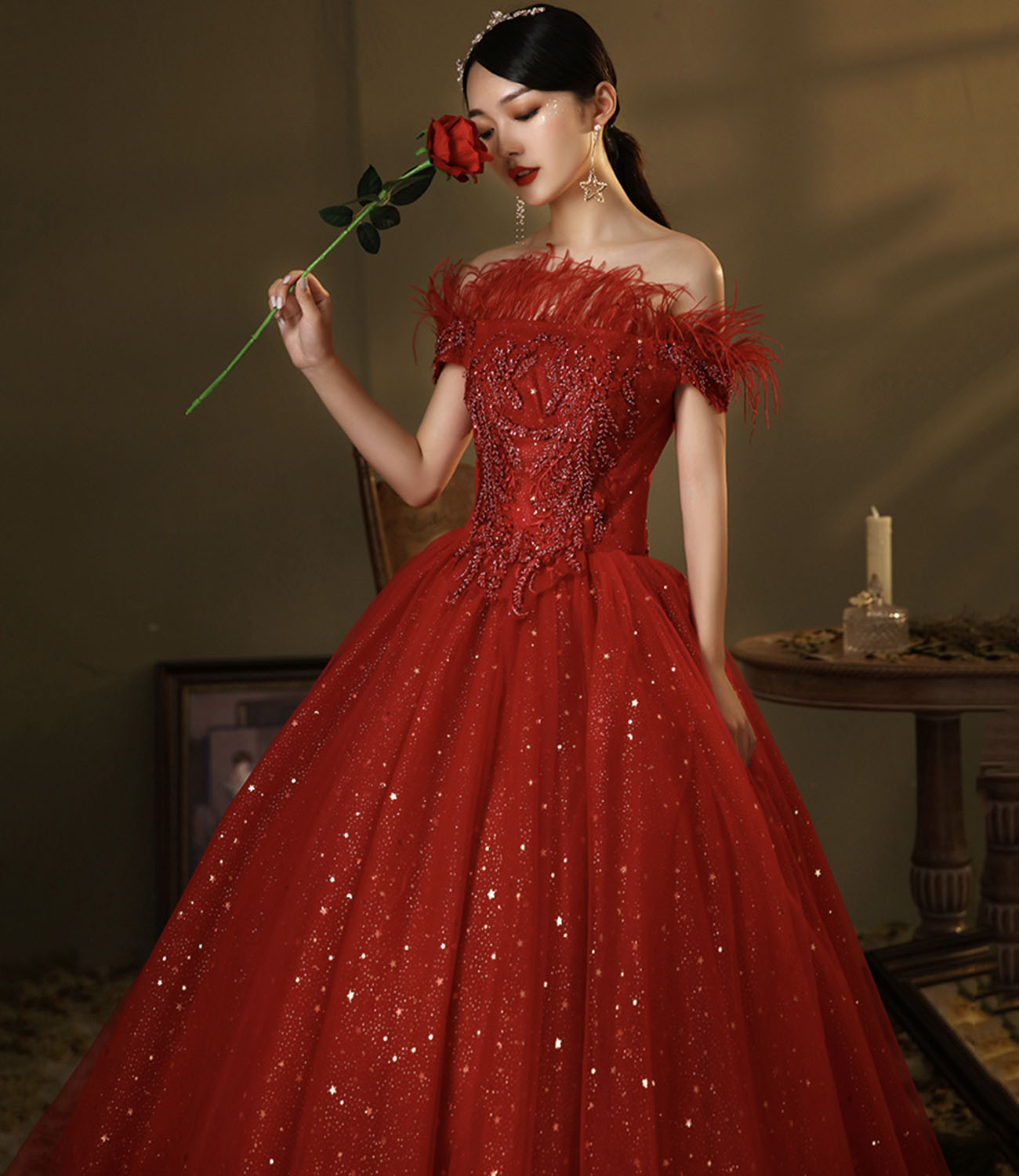- Red tulle sequins long ball gown dress A line evening dress -