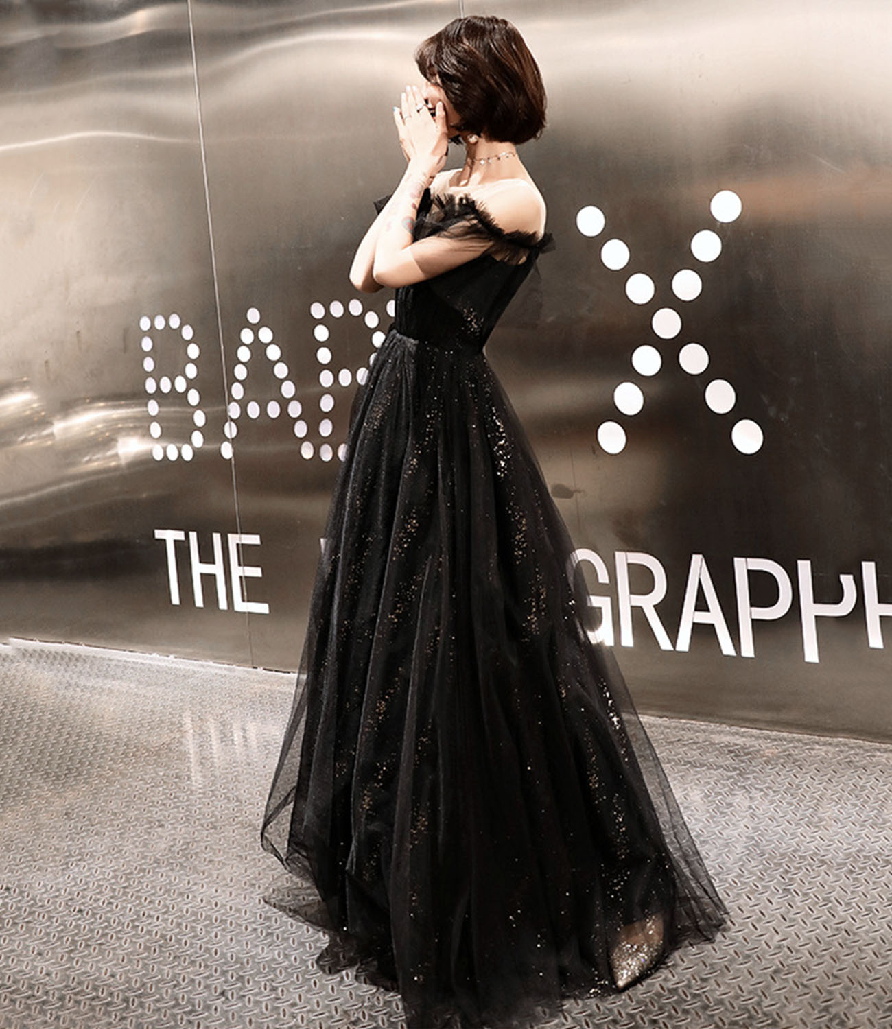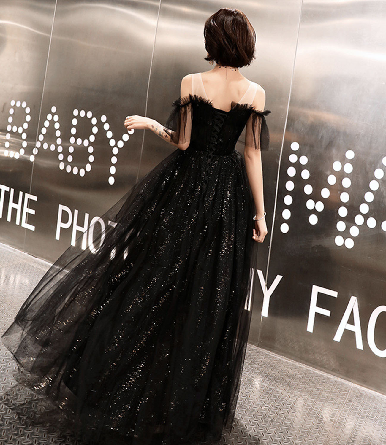 - Black tulle long prom dress A line evening dress -