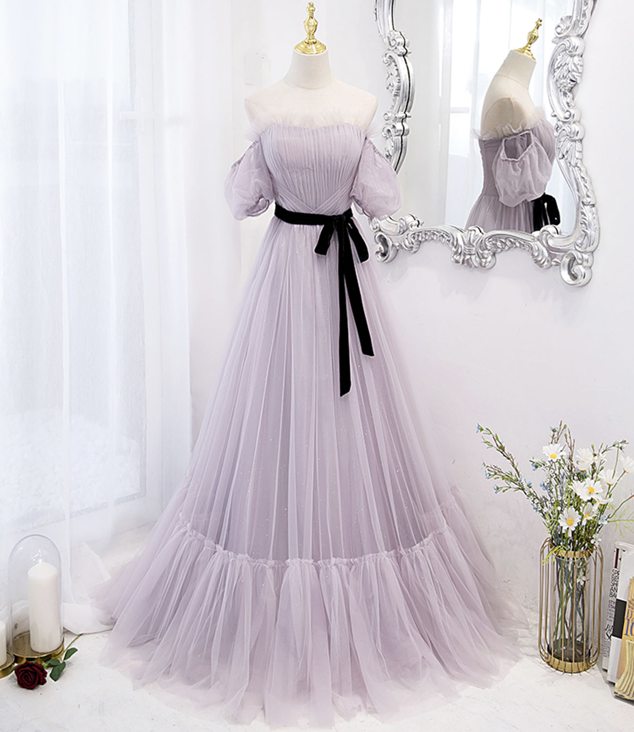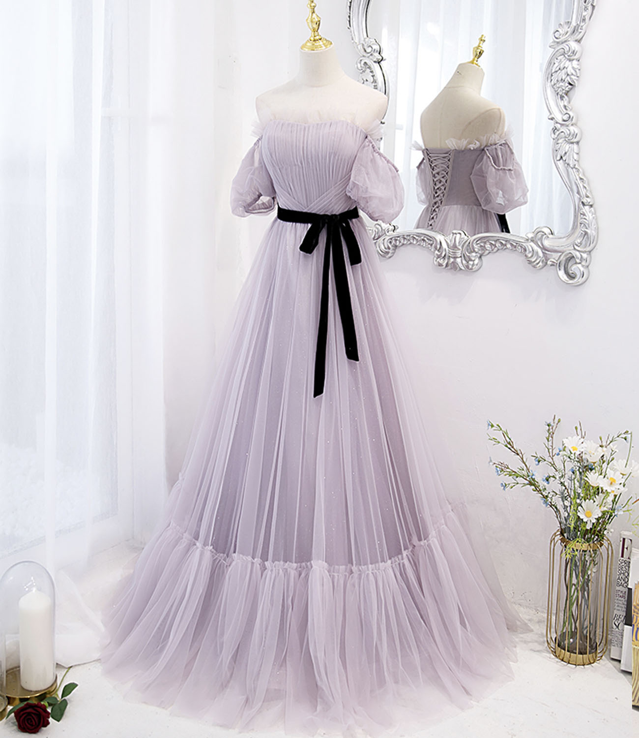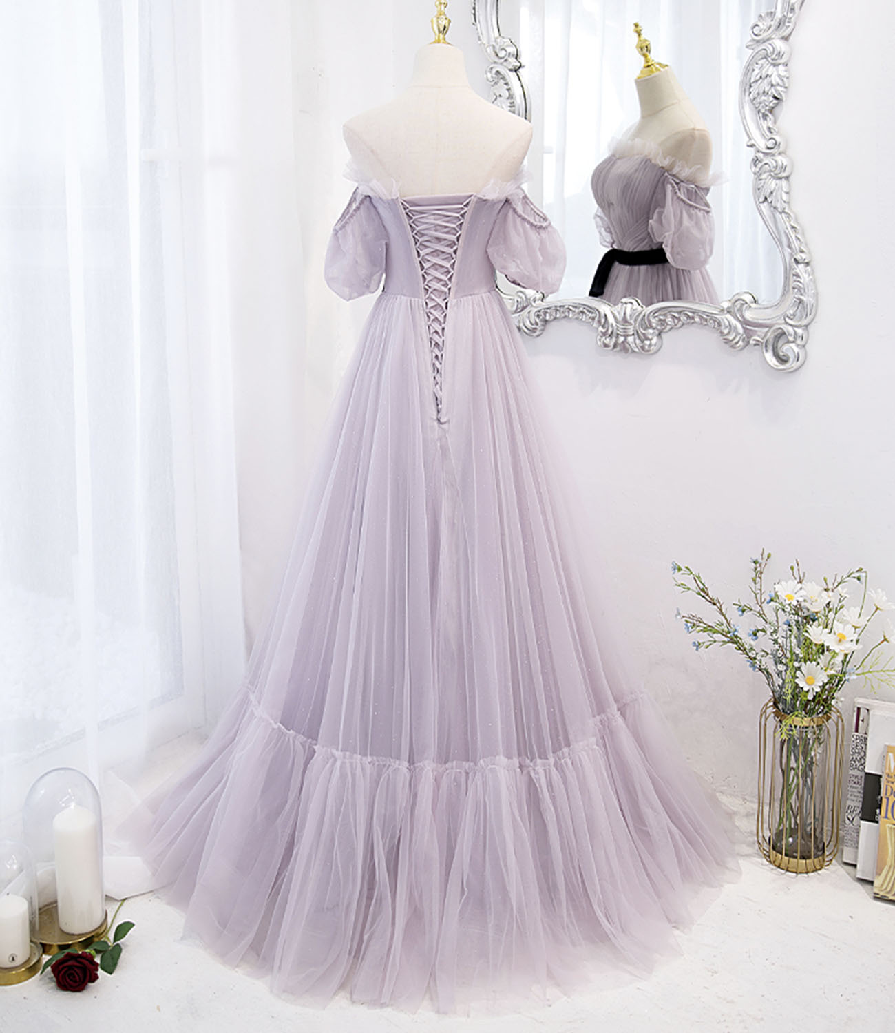 - Purple tulle long prom dress A line evening dress -