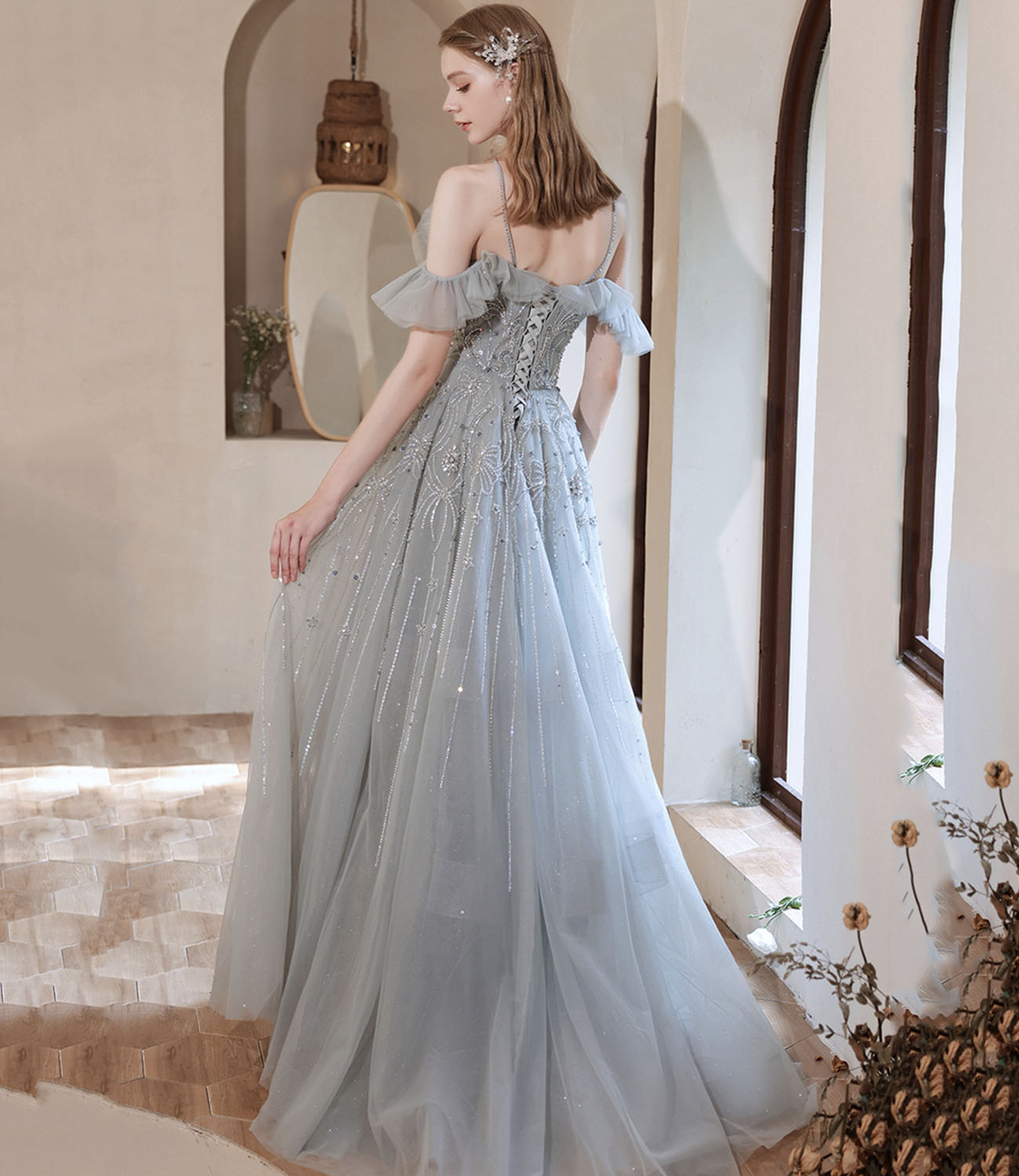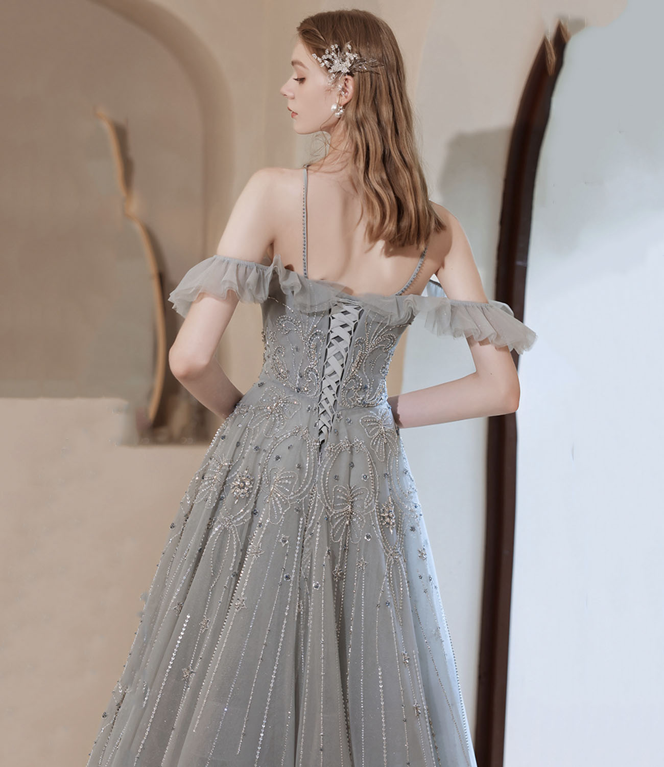 - Gray tulle beads long prom dress A line evening dress -