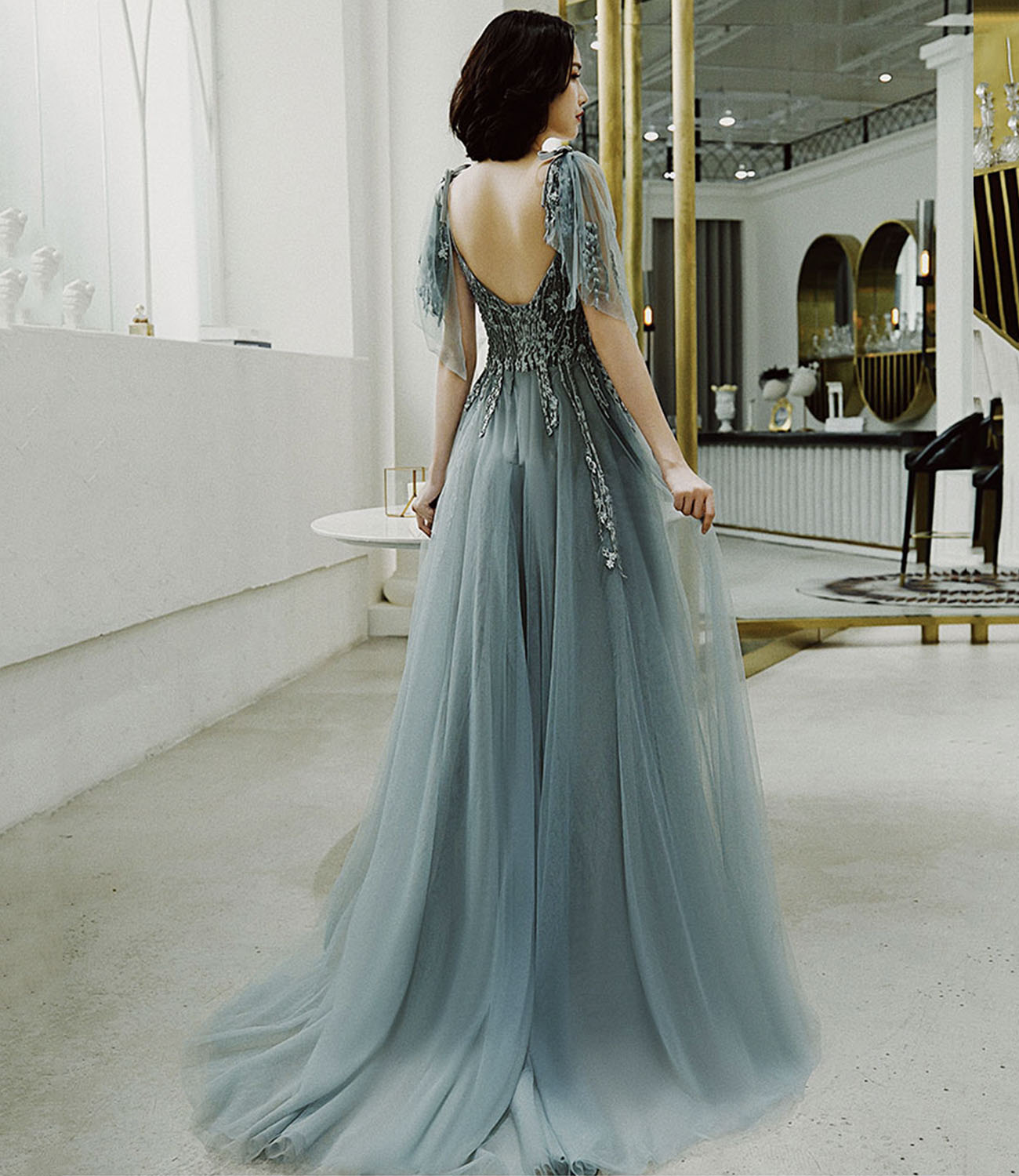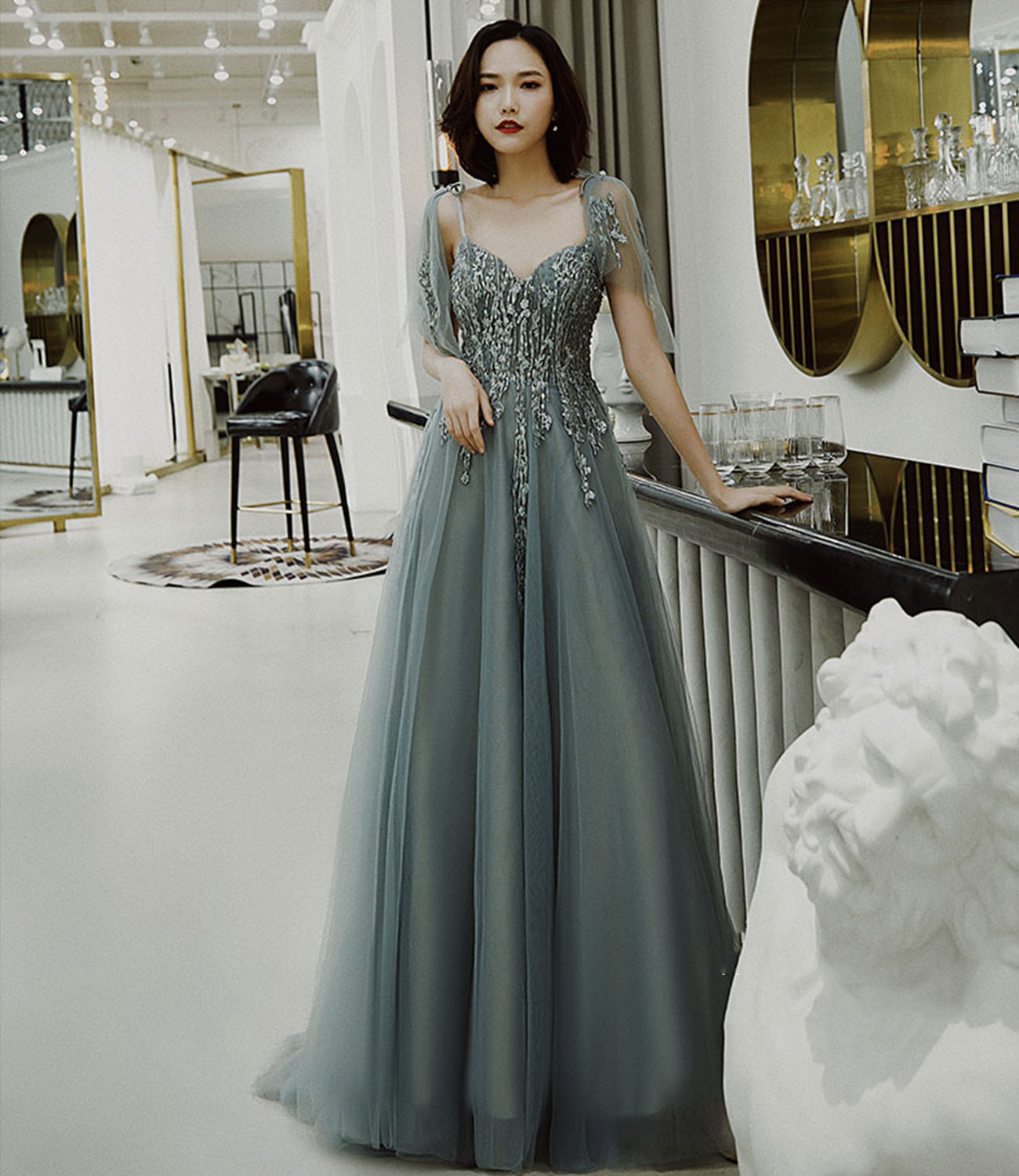 - Cute tulle lace long prom dress A line evening dress -