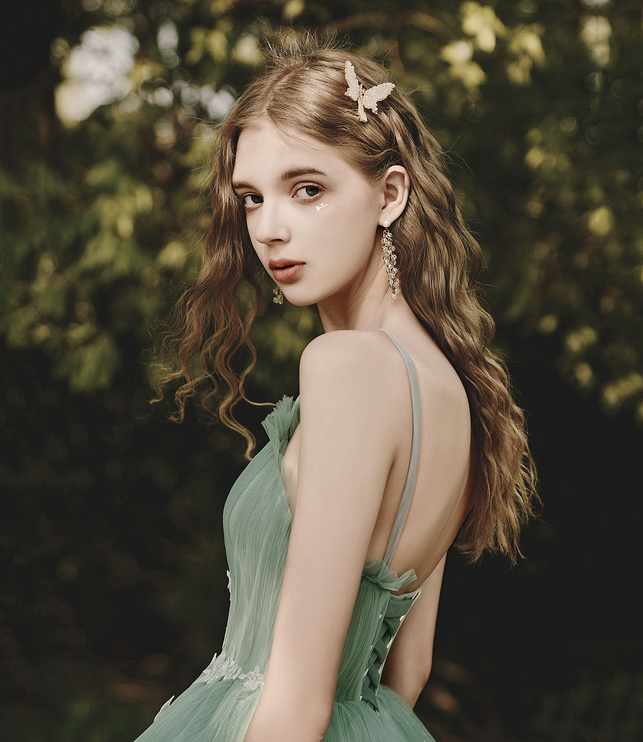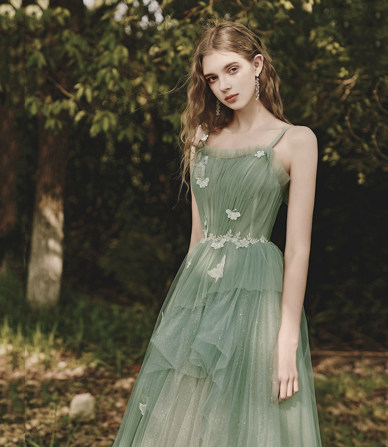 - Green tulle lace long prom dress A line evening dress -