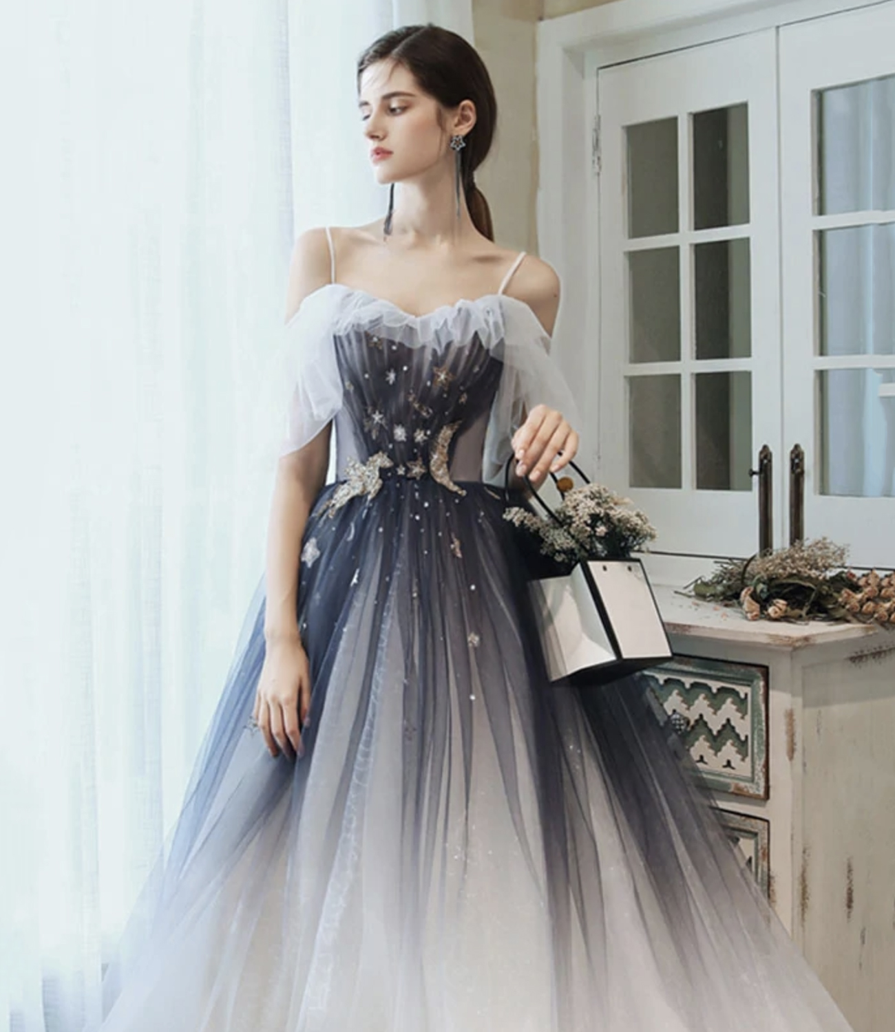 - Blue tulle sequins long prom dress A line evening dress -