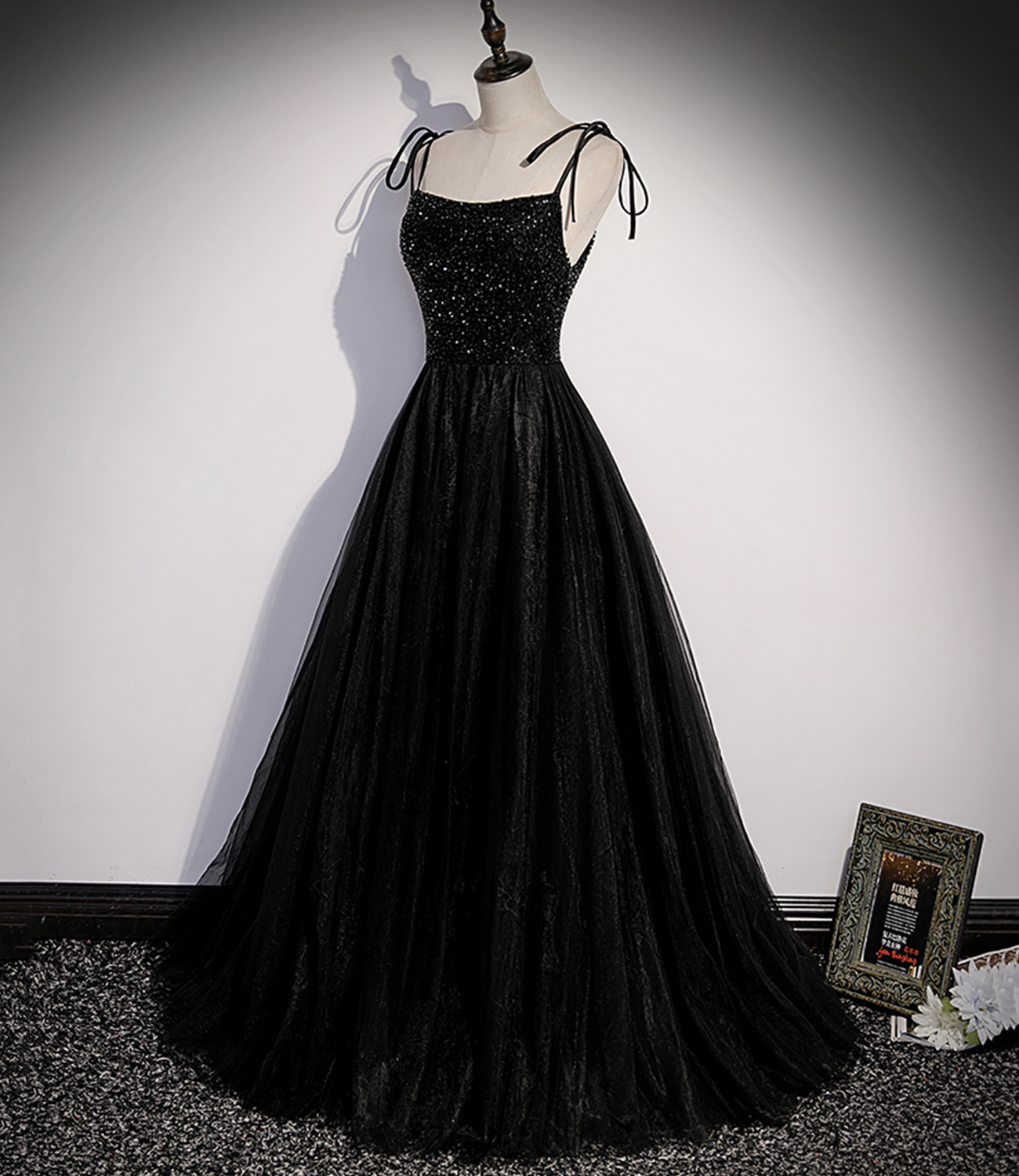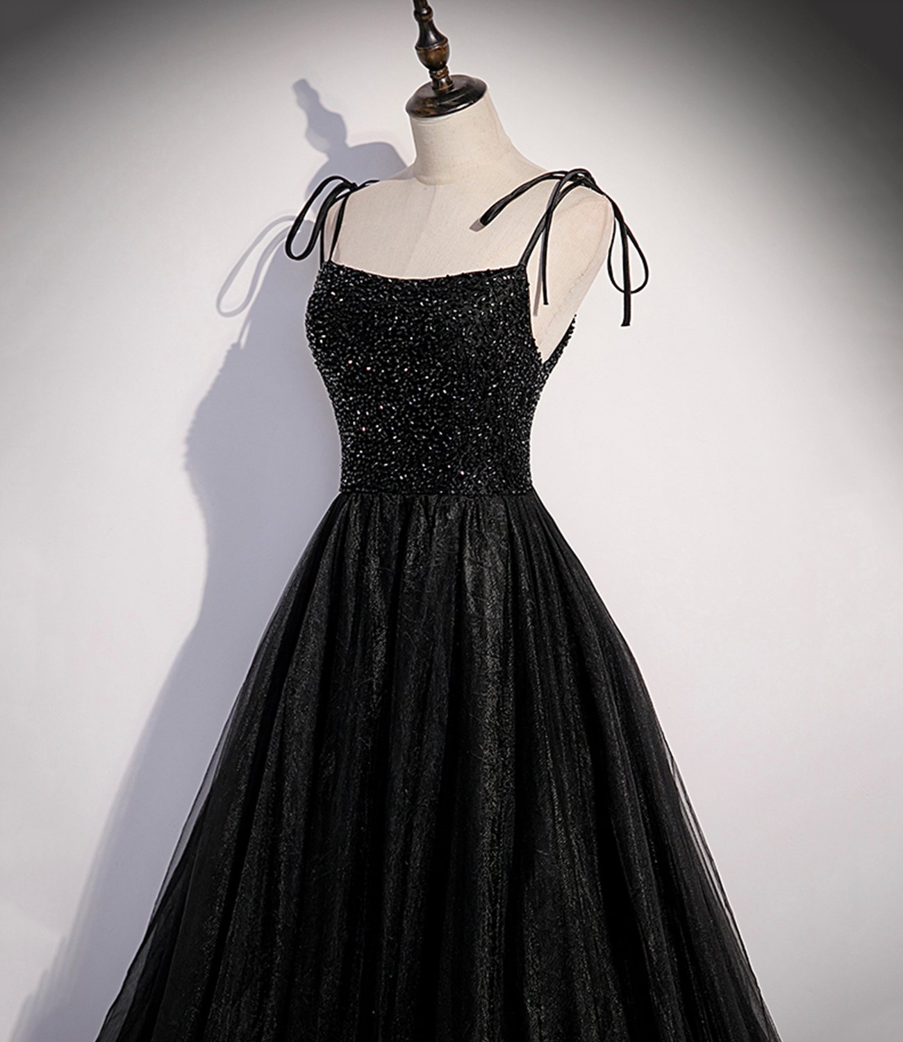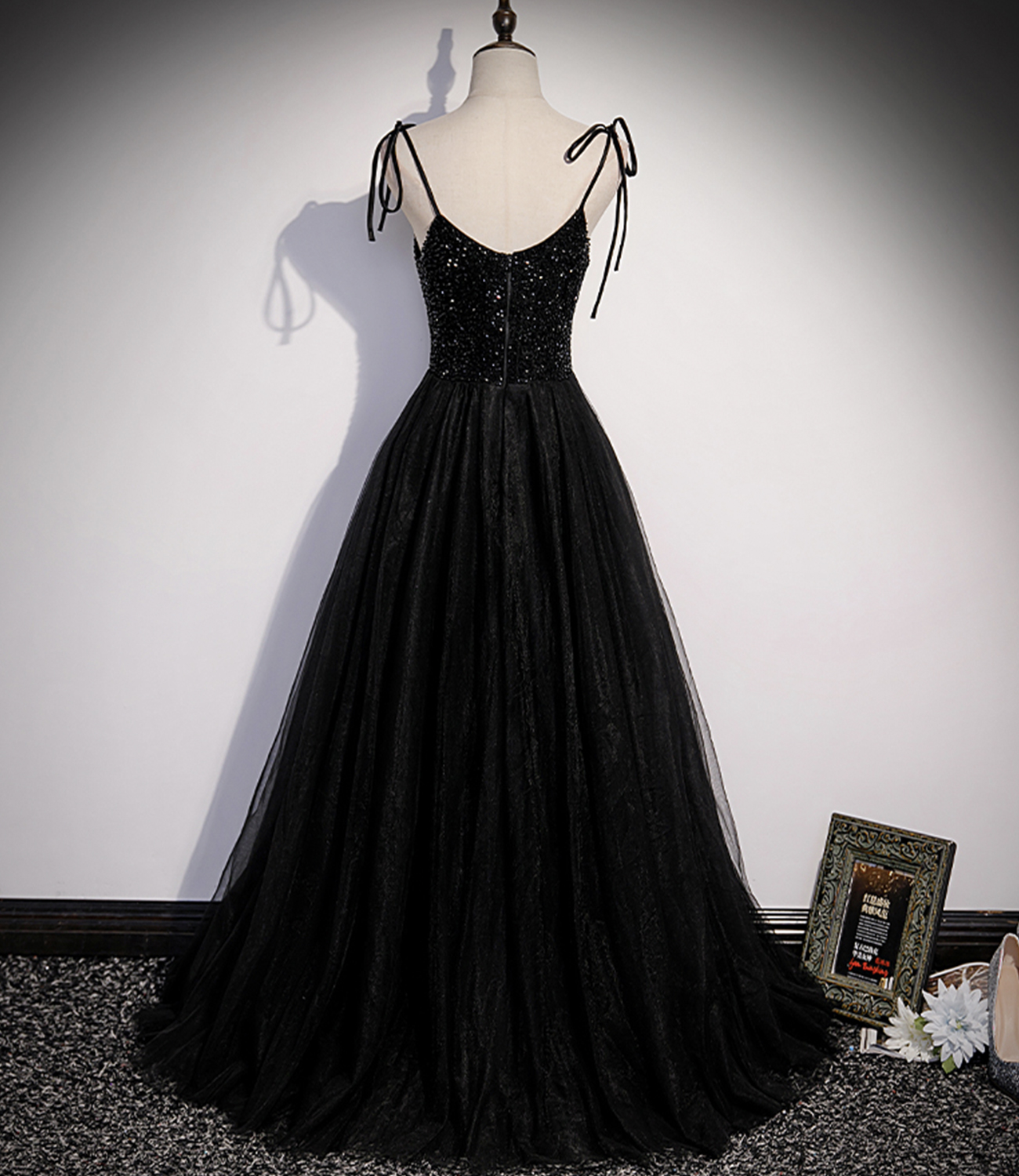 - Black tulle beads long prom dress A line evening dress -