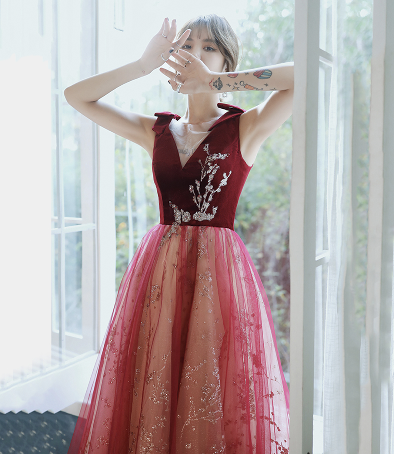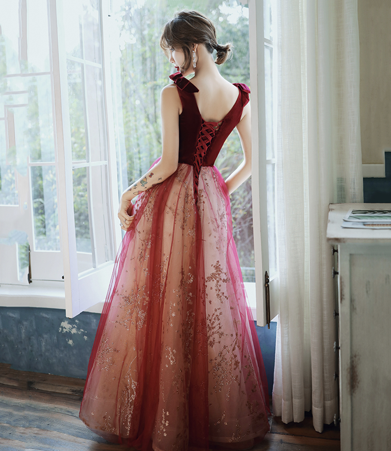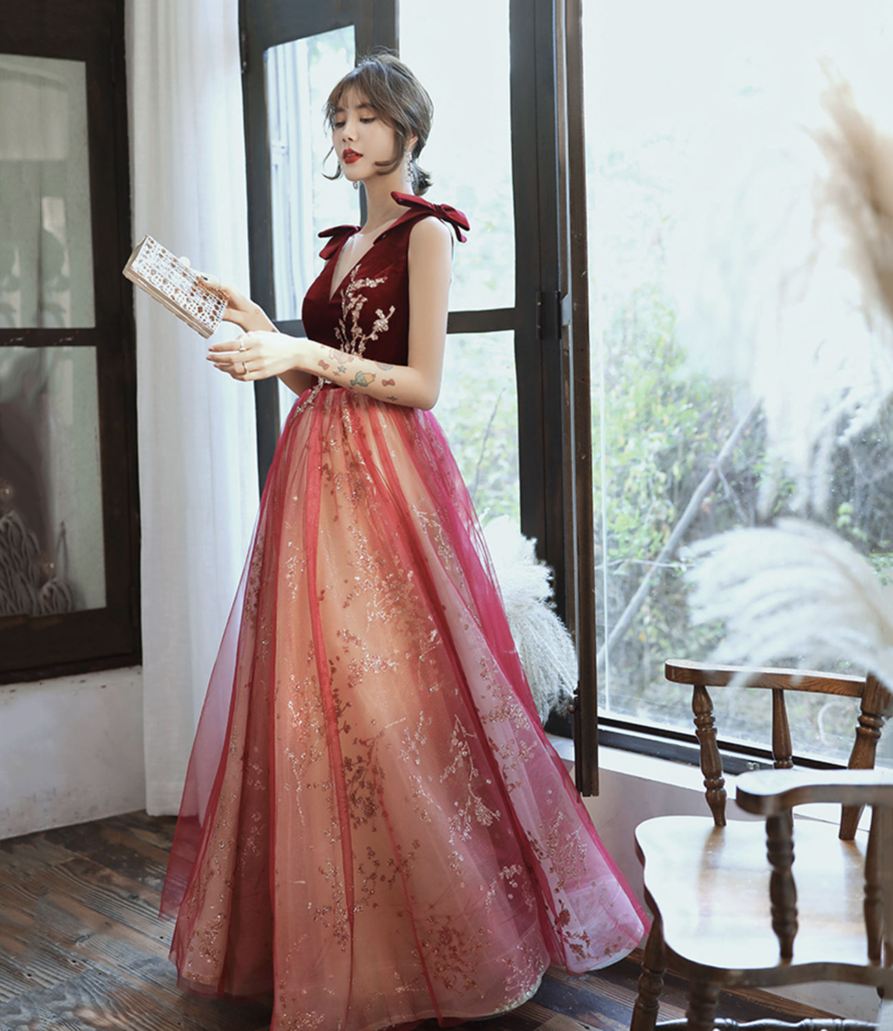 - Burgundy velvet tulle long prom dress A line evening gown -
