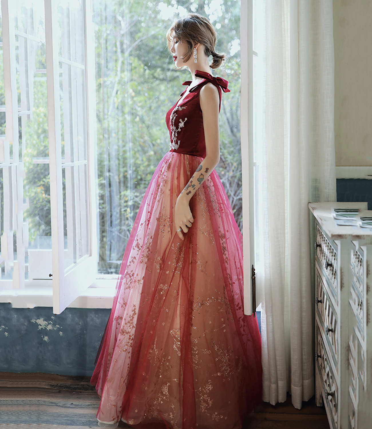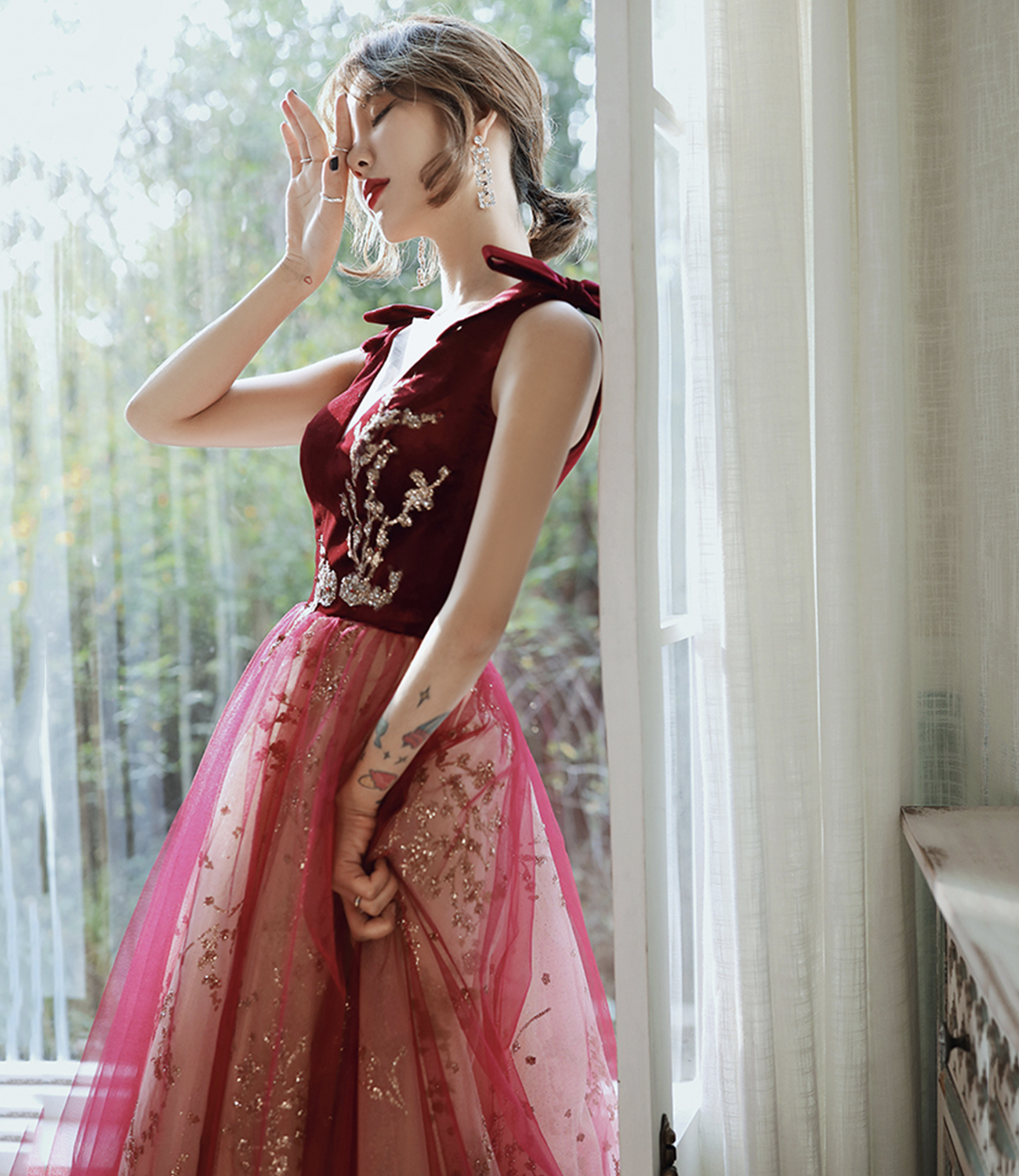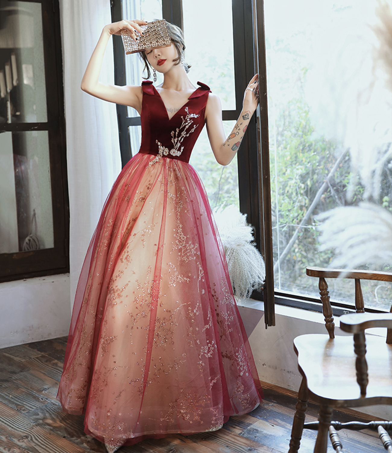 - Burgundy velvet tulle long prom dress A line evening gown -