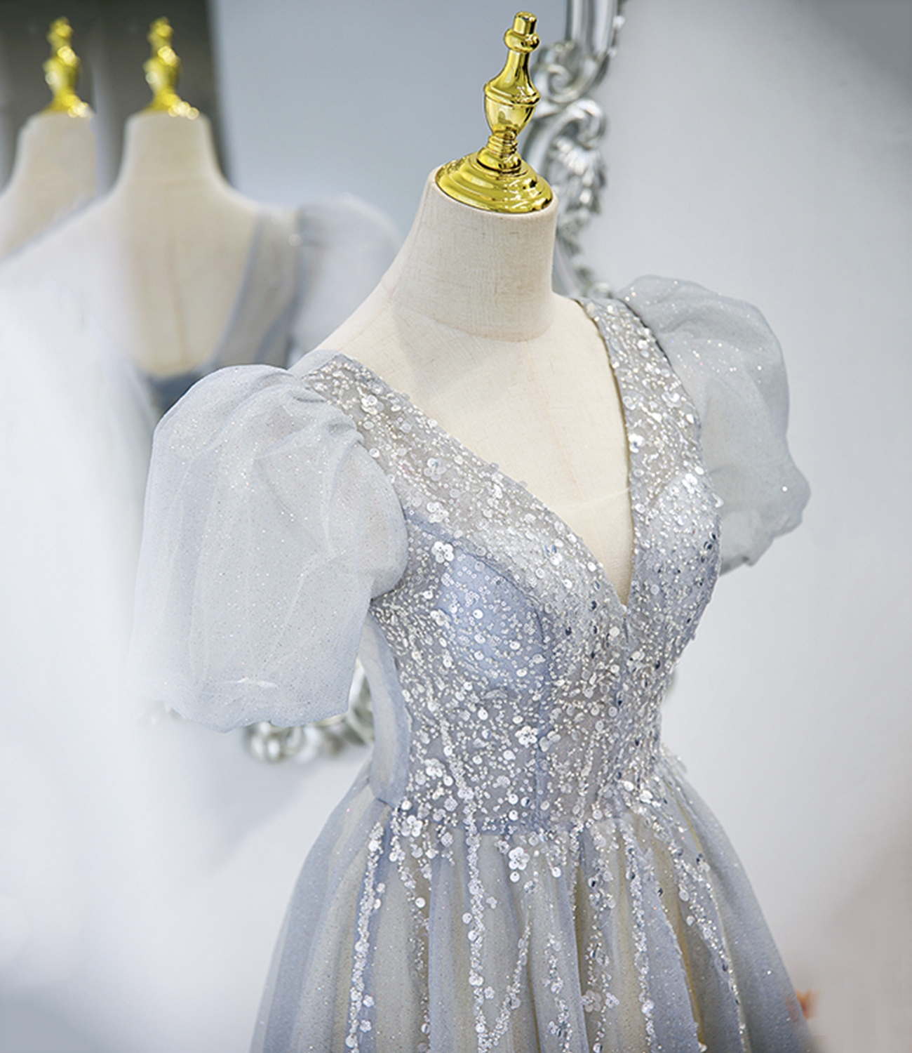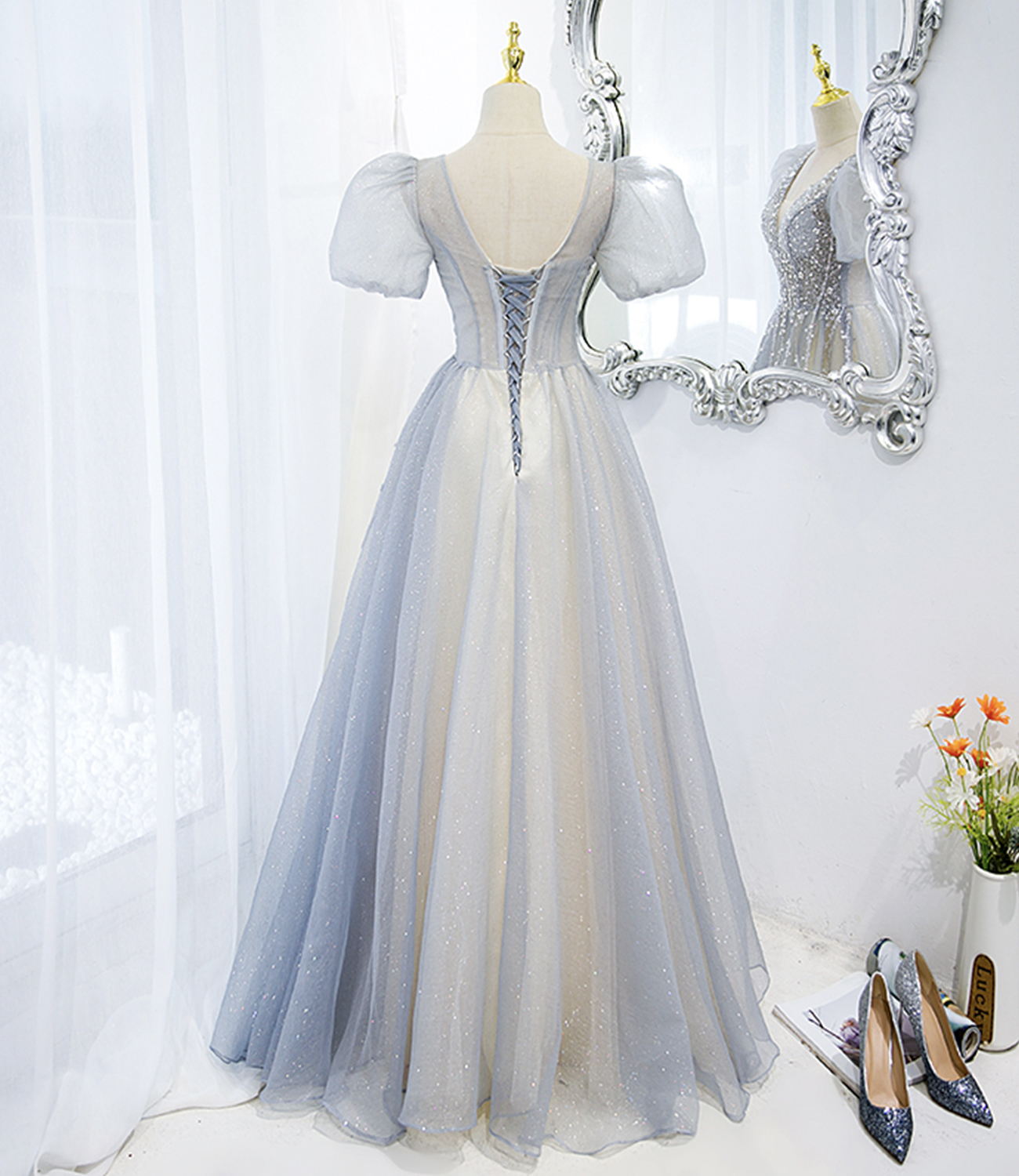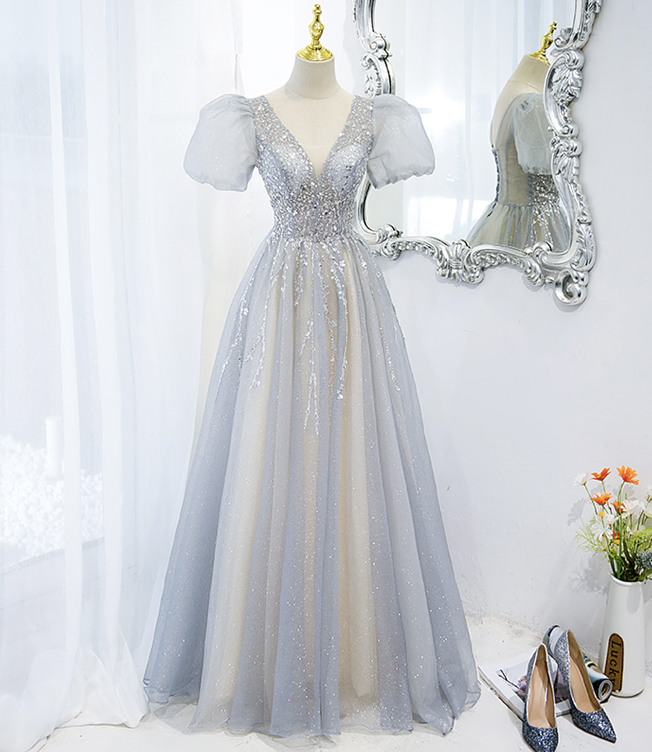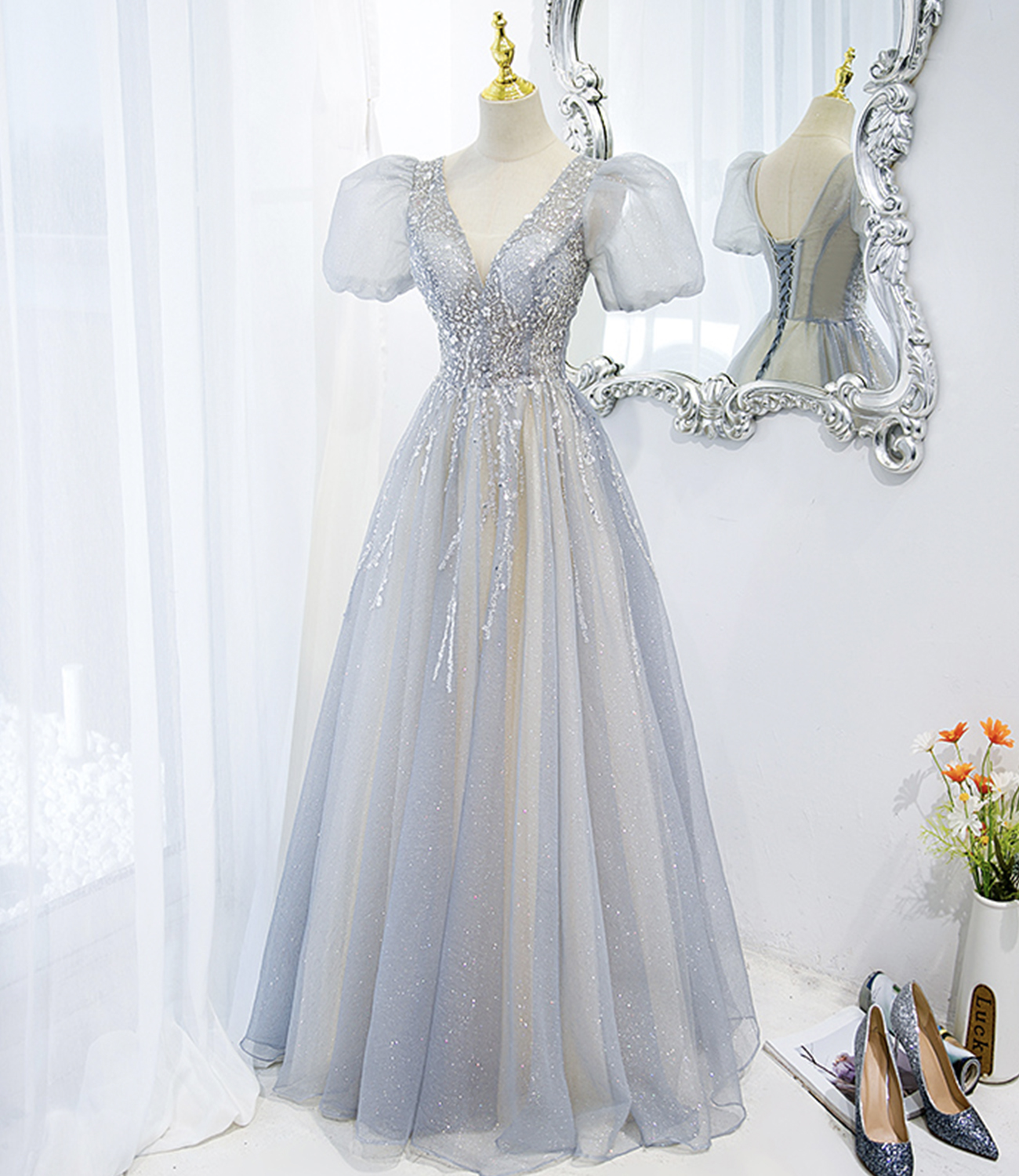 - Gray tulle beads long prom dress A line evening gown -