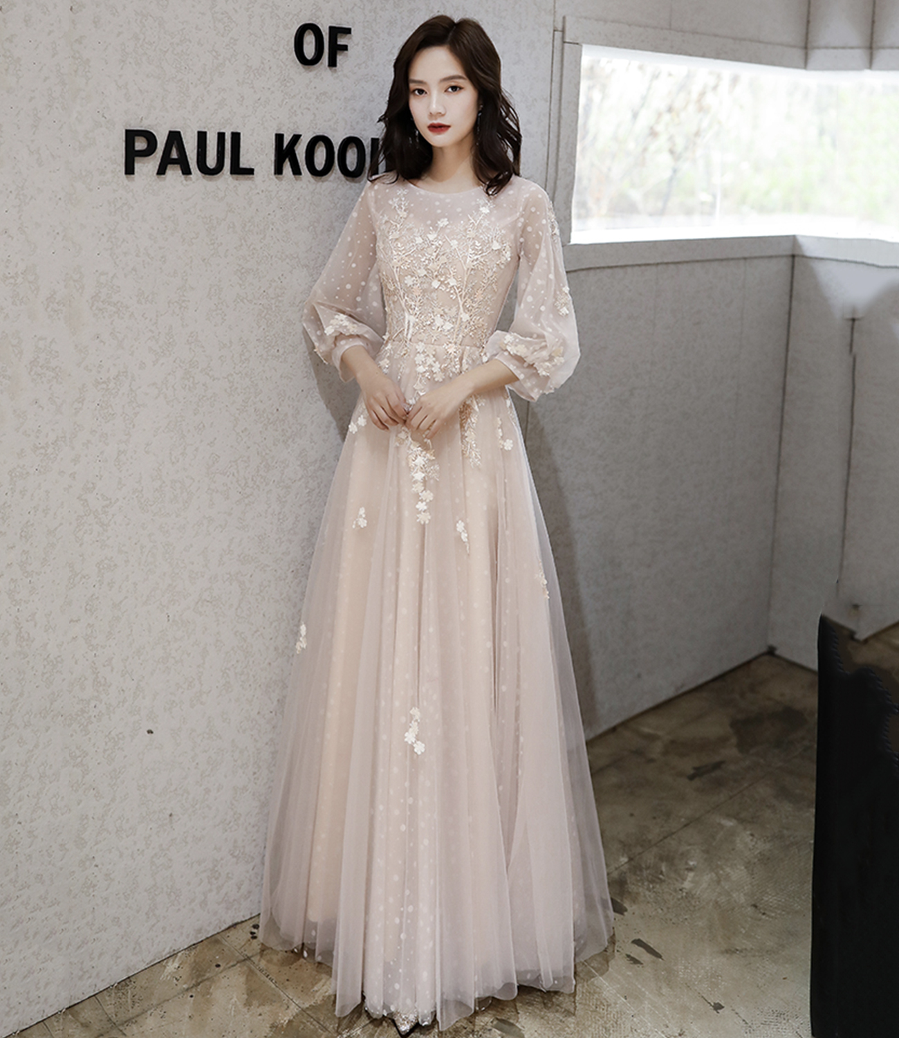 - Cute tulle lace long prom dress A line evening dress -