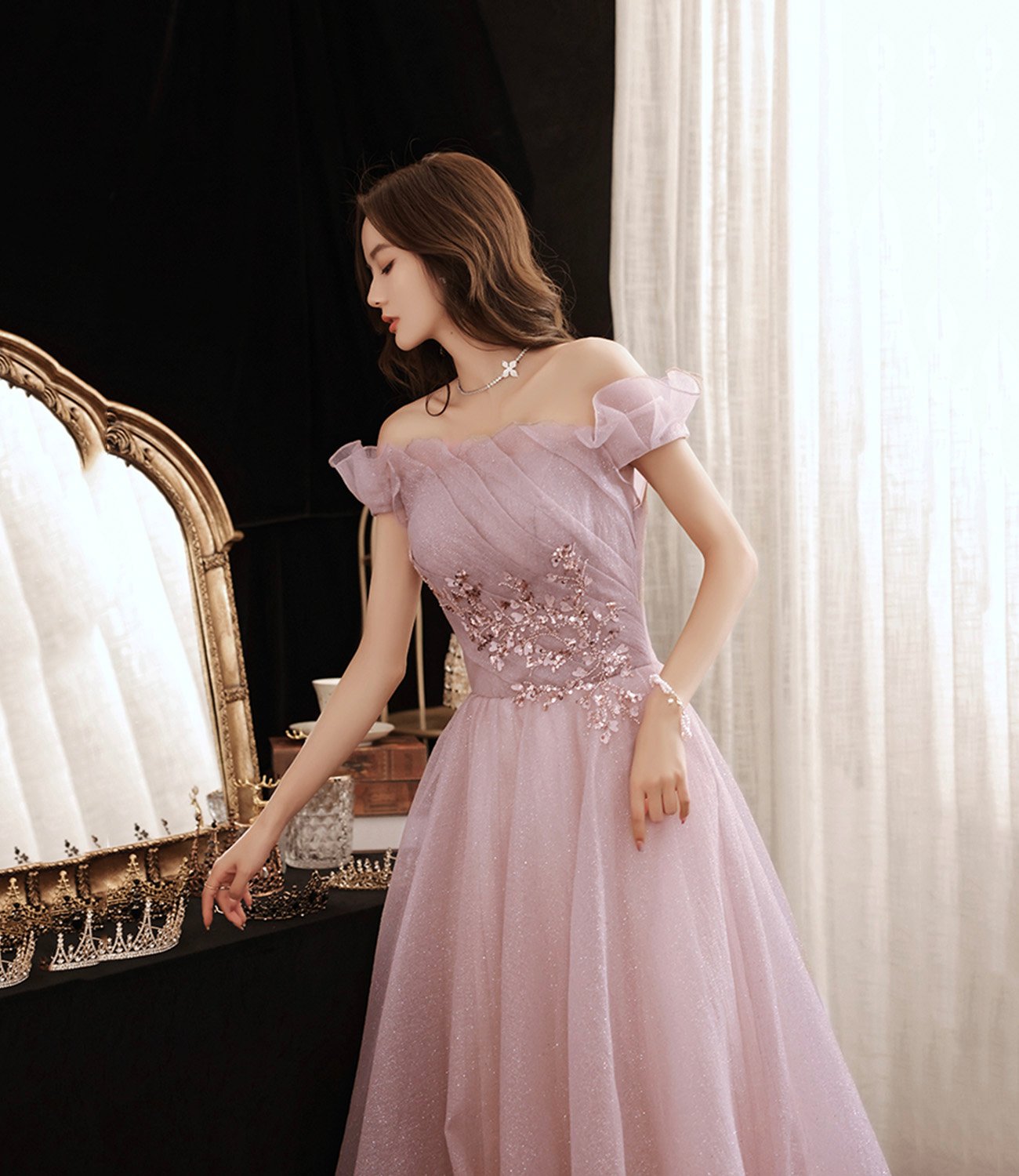 - Pink tulle sequins long prom dress pink evening dress -